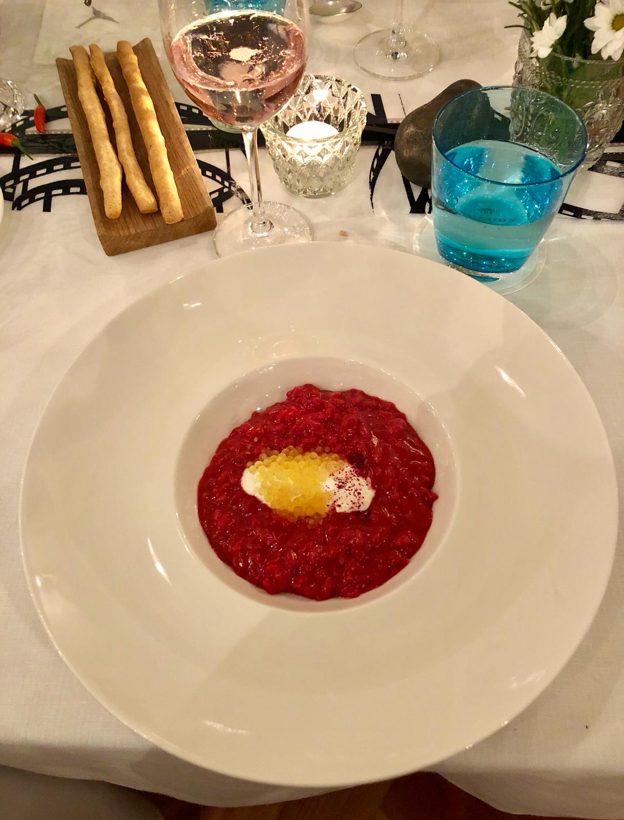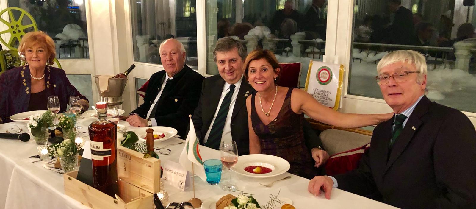 La Delegazione di Cortina d'Ampezzo ha organizzato presso il "Cristallo Resort & Spa" di Cortina la riunione conviviale “Ciak, si mangia”, dedicata al legame tra cinema e cibo. Foto 1: la Delegata Monica De Mattia con, alla sua sinistra, Piergiulio Giordani Pavanelli Direttore Centro Studi Territoriale Emilia e Segretario di Bologna e, alla sua destra, Franco Zorzet Coordinatore Territoriale Veneto e Delegato di Venezia Mestre, Luigi Grasselli Delegato Onorario di Cortina d'Ampezzo e la Simposiarca Silvana Savaris Grasselli. Foto 2 e 3: alcune portate della cena a tema con piatti visti nei film proiettati nella prima parte della serata.