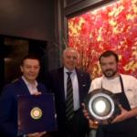 La Delegazione di San Francisco si è riunita presso il ristorante "AltoVino" in occasione della riunione conviviale. Foto 1: (da sinistra) Claudio Villani proprietario e sommelier, il Delegato di San Francisco Claudio Tarchi, il cuoco Nick Kelly con il piatto in silver dell'Accademia. Foto 2: (da sinistra) Marie Francoise di Ruocco con l’Accademico Carlo di Ruocco.