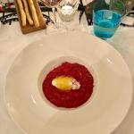 La Delegazione di Messina, in occasione della riunione conviviale, si è riunita presso il ristorante "Grecale". Foto 1: il Delegato Francesco Trimarchi insieme ai proprietari, lo chef Paolo Romeo e la squadra di cucina. Foto 2: un momento della serata con gli ospiti a tavola. Foto 3 : risotto con burrata e quenelle di ricciola (in tartare). Foto 4: variante di triglia.