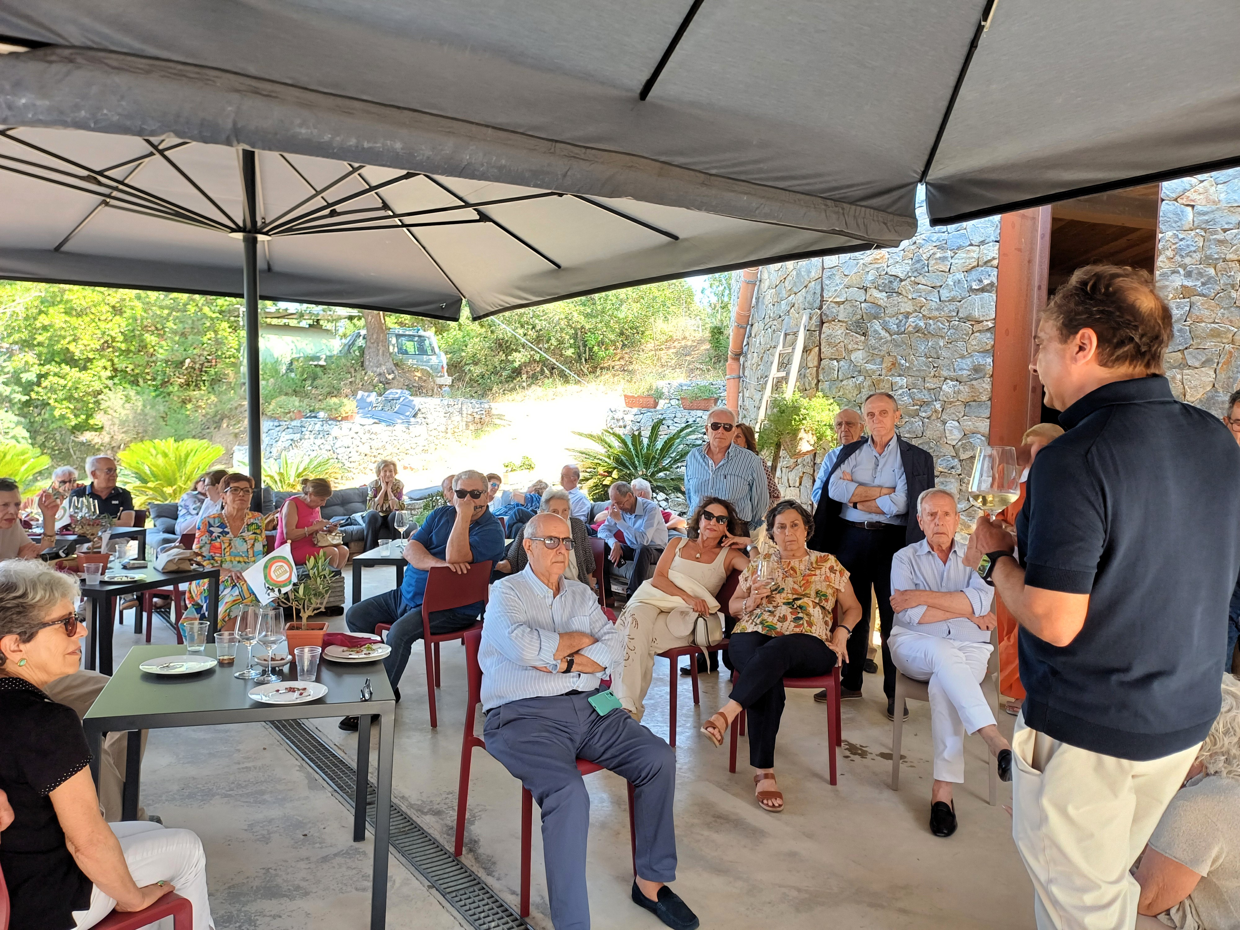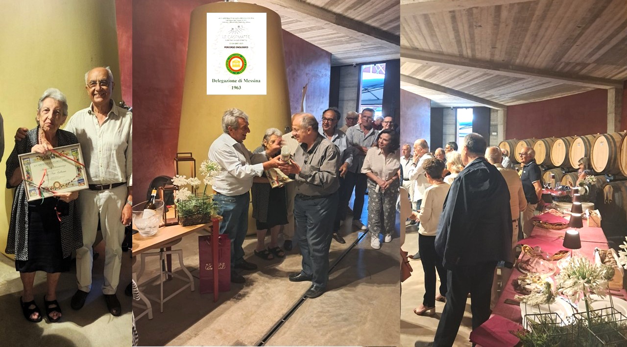 Esperienza immersiva vitivinicola nel cuore della denominazione Faro DOC, nella cantina Le Casematte, con percorso enologico accompagnato da abbinamenti fra i più noti della tradizione gastronomica messinese. Dopo la visita alla vigna e ai locali della cantina con i contenitori di affinamento, il percorso e la filiera enologica sono stati illustrati dal fondatore Gianfranco Sabbatino, affiancato nell’impresa vinicola da Andrea Barzagli. Gli Accademici si sono poi ritrovati nella sala degustazione, in parte interrata, dove sono stati serviti sfizi al vassoio e piatti della tradizione al buffet, tra cui tuma fritta, crocchette, bracioline alla messinese, salumi e formaggi, caponatina, pizza alla disgraziata e fusilli al pesto trapanese. Piatti sapientemente accostati al Peloro bianco DOC, al Pharis DOC 2023, al Rosematte IGP, al Nanucci IGP 2023 e al Faro DOC 2023, che hanno registrato corale apprezzamento per il gusto classico e moderno, frutto di una conduzione biologica del piccolo vigneto. Dopo il conferimento dell’attestato di benemerenza del Presidente e del distintivo con brillante Swarovski a Pina Noè Cultrone per i suoi quarant’anni di Accademia, e del diploma di appartenenza e distintivo dei 35 anni all’accademico Paolo Scarcella, il particolare convivio si è concluso con la consegna del guidoncino al titolare della Cantina, plaudendo per vini, proposta gastronomica e servizio.