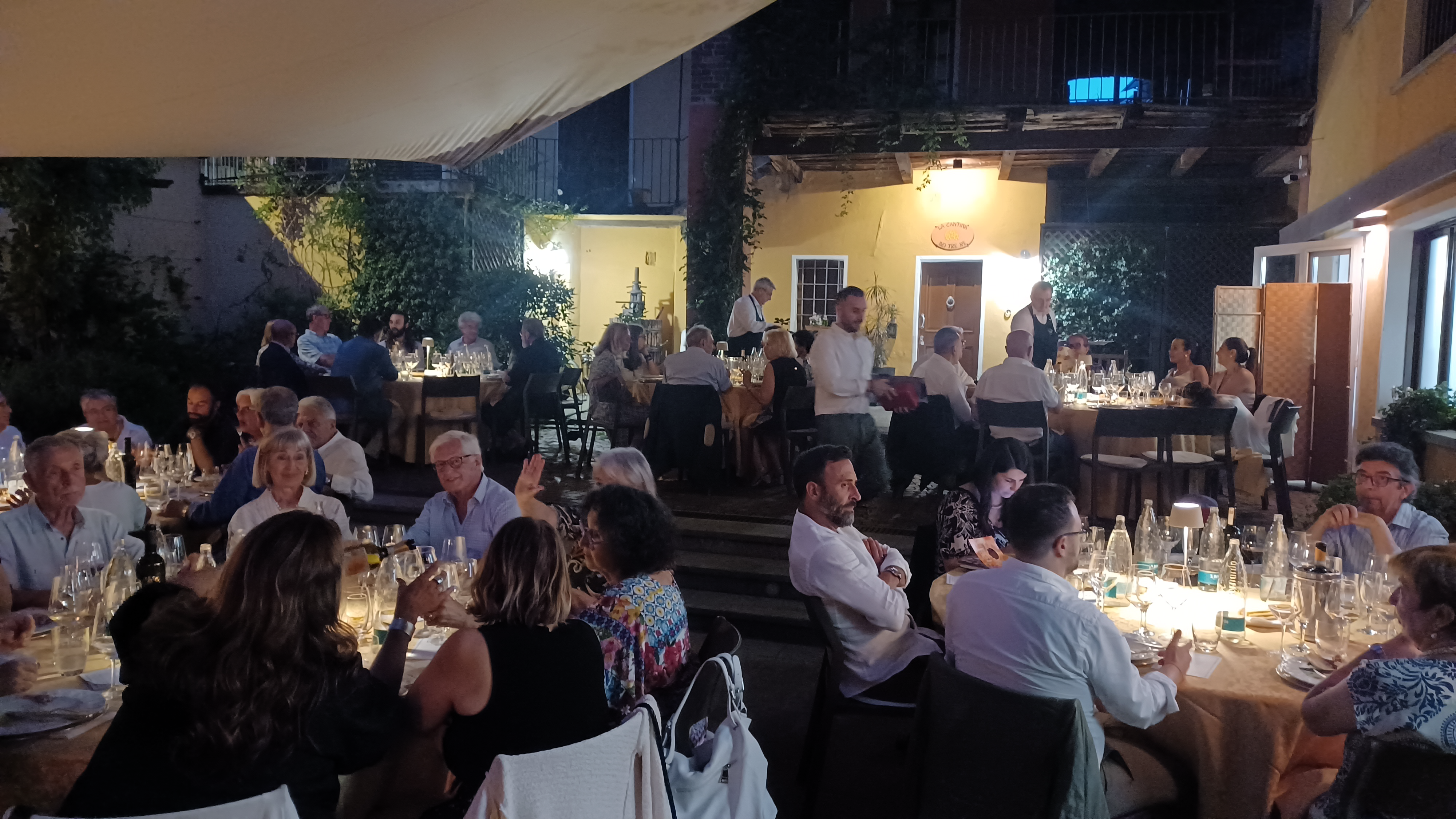 La Delegazione del Monferrato si è ritrovata per la riunione conviviale in Murisengo. La frazione di Corteranzo domina la valle ed è nota per la splendida chiesetta campestre dedicata a San Luigi Gonzaga edificata nel ‘700 dall’arch. Vittone su progetto dell’arch. Juvarra. Il ristorante la Canonica, con la sua splendida terrazza e il palazzo settecentesco, ha fatto da teatro per la gradevole serata estiva. Il Delegato Pietro Caire ha scelto per la serata un fresco menù con aperitivo “Monferrino” e una portata nella sala interna. Il menù proposto: bicchierino di giardiniera, focaccia con salame cotto della Valcerrina, frittata campagnola di cipolle, crostoni con lingua e acciughe al verde, peperoncini ripieni, ovetto di insalata russa e barattolino di carpione. Come piatto principale, è stato servito un petto d’anatra della Valcerrina accompagnato da gel di pompelmo e purè di carote. A chiudere, un semifreddo al croccante di nocciole con coulis ai frutti di bosco ha concluso in modo piacevole la cena.