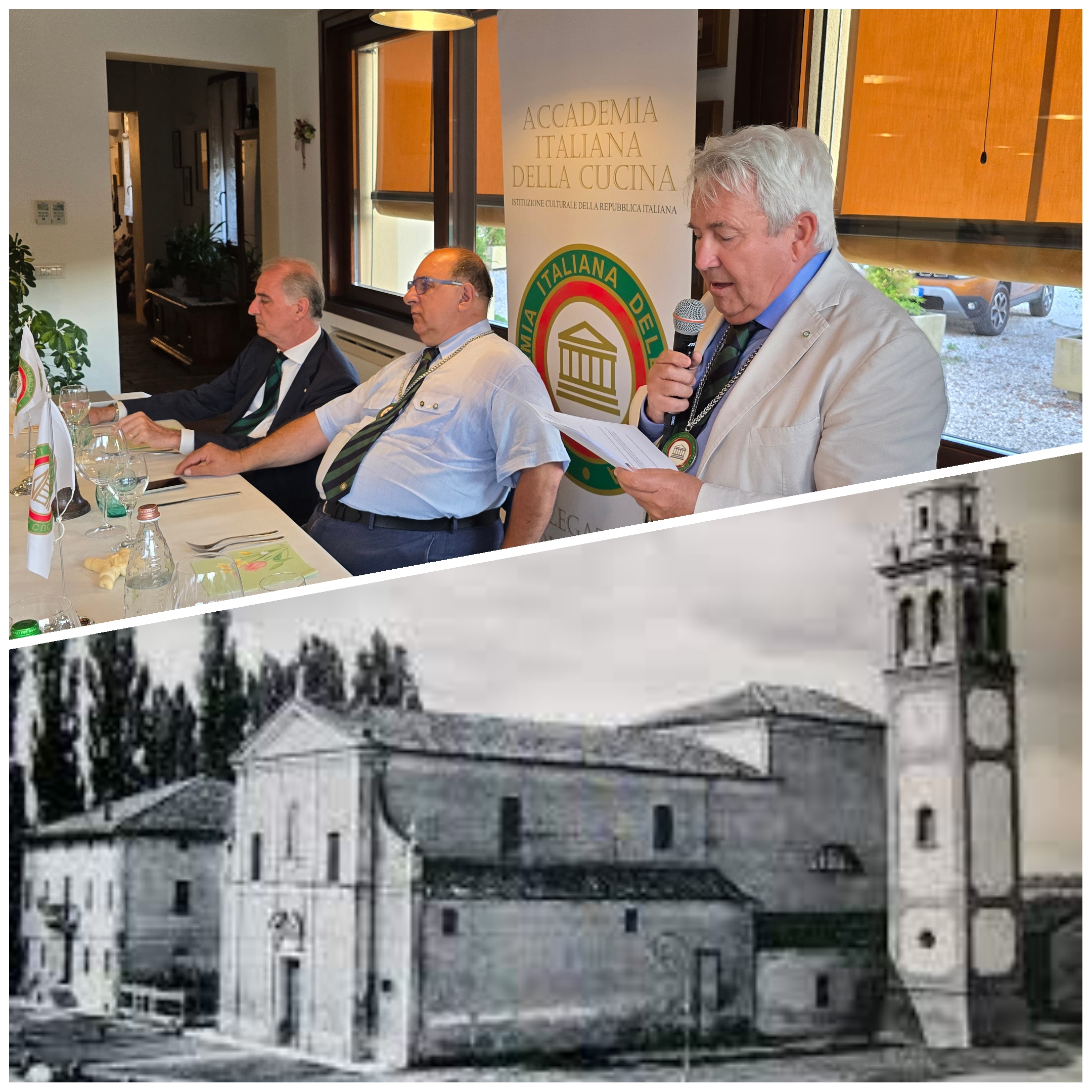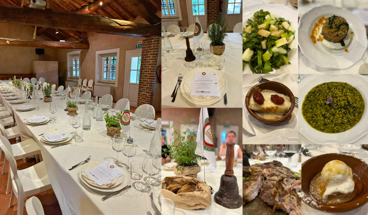Per la riunione conviviale dell’estate, gli Accademici hanno scoperto un luogo magico di biodiversità, con una storia quasi millenaria, dove la cultura della terra incontra l’ingegno, nel cuore del Parco del Ticino: il territorio della Carem, nome che deriva da "quaresima", poiché bonificato dai monaci cistercensi dell’Abbazia di Morimondo. Gabriele Corti, patron di Cascina Caremma, ha guidato gli ospiti in un’immersione nella storia, passata e presente, di un grande patrimonio che fu dei Visconti di Modrone e della Fondazione Ca’ Granda. Dall’orto ai campi, dai canali alle risaie, dalla vigna agli allevamenti: un racconto vivo di una famiglia che coltiva il sogno di un ecosistema interdipendente. Accolti nella frescura per un aperitivo con i salumi del norcino e i formaggi di capra, è stato studiato, insieme al Vice Delegato Davide Vignotti, un menu iconico, pensato per evocare il contesto con le sue suggestioni. Il tutto è stato servito su un tavolo imperiale allestito nel suggestivo granaio seicentesco.