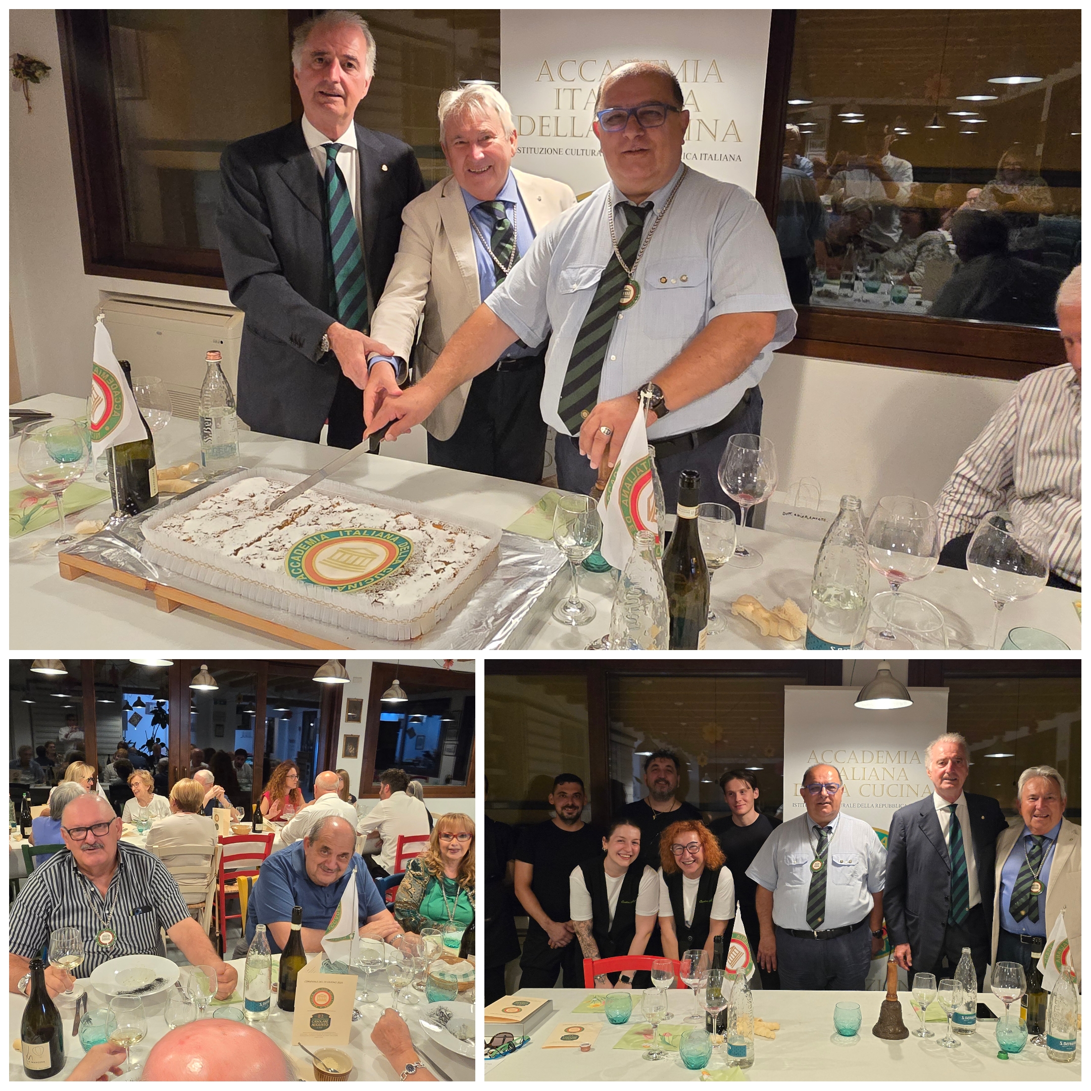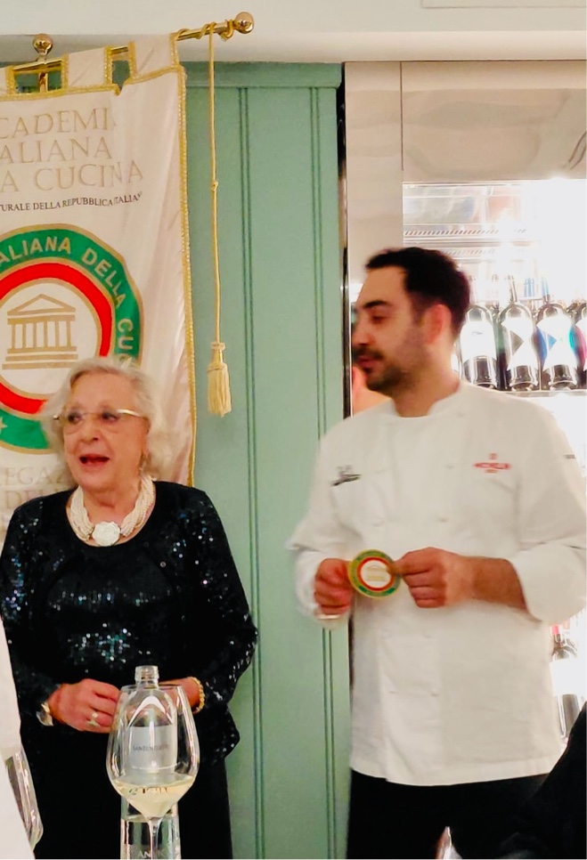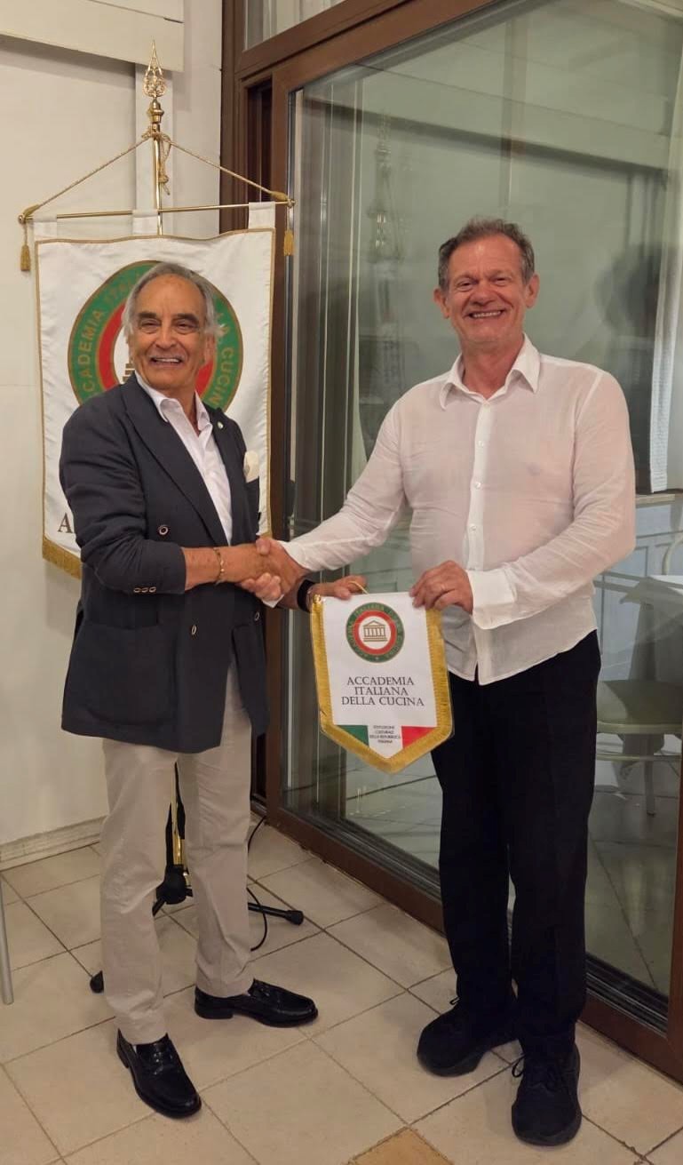 Conviviale all’insegna dell’amicizia e della buona tavola, preparata con cura e maestria dallo chef Alessandro Ferrarini del ristorante Sciabola. La serata è stata arricchita da due momenti speciali: l’ingresso della nuova Accademica Vanessa Stefanelli, accolta con la tradizionale spilla consegnata dalla Delegata Anna Ricci, dall’Accademico James Borghi e dal segretario Bruno Toni; e, al termine del conviviio, il festeggiamento del consultore Ermanno Cervone in occasione del suo compleanno. I piatti proposti dallo chef sono stati molto apprezzati per il gusto autentico e la valorizzazione del pescato locale, espressione di una cucina moderna ispirata alla tradizione italiana. Il menu ha previsto un aperitivo di benvenuto con crocchette di gambero, un antipasto a base di razza alla mugnaia con fagiolini alla menta e salsa olandese; il primo piatto risotto "Riserva San Massimo" mantecato ai frutti di mare, calamaretti, seppioline e sparnocchio; un secondo di ombrina al forno con cipollotto, capperi e olive, e infine un dessert con sfoglia croccante, crema chantilly e lamponi al profumo di basilico, il tutto accompagnato da un’ottima selezione di vini. Applausi e ringraziamenti finali allo chef Alessandro Ferrarini per la sua professionalità.