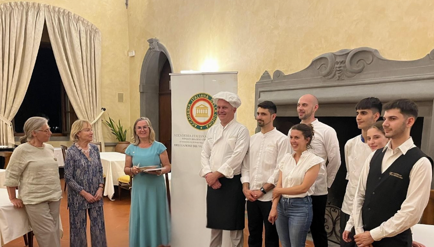 Per la riunione conviviale del mese di giugno è stata scelta una location di grande suggestione: la tenuta del Castello di Vicchiomaggio, nel cuore del Chianti. Lecci secolari dominano il giardino del Castello, dimora storica fin dal IX secolo, edificata come fortezza e nei secoli trasformata in residenza della famiglia Matta. Le Accademiche Assia Olivieri e Paola Mainardi, in qualità di Simposiarche, hanno scelto un menù legato alla tradizione ma reso contemporaneo dagli chef Leonardo Lapenta e Nicola Vanni. Sapori delicati e impiattamenti eleganti e colorati hanno caratterizzato la proposta gastronomica. I vini sono stati forniti dall’azienda vinicola del Castello, che propone premiate etichette. La Delegata Roberta Ceppatelli, insieme alle Simposiarche, ha consegnato agli chef Lapenta e Vanni il piatto commemorativo per i 70 anni dell’Accademia.