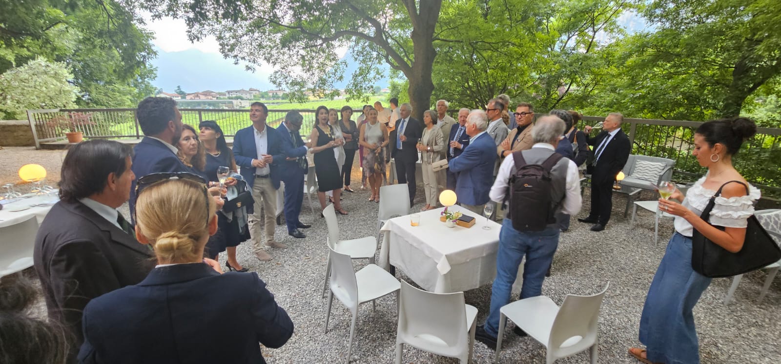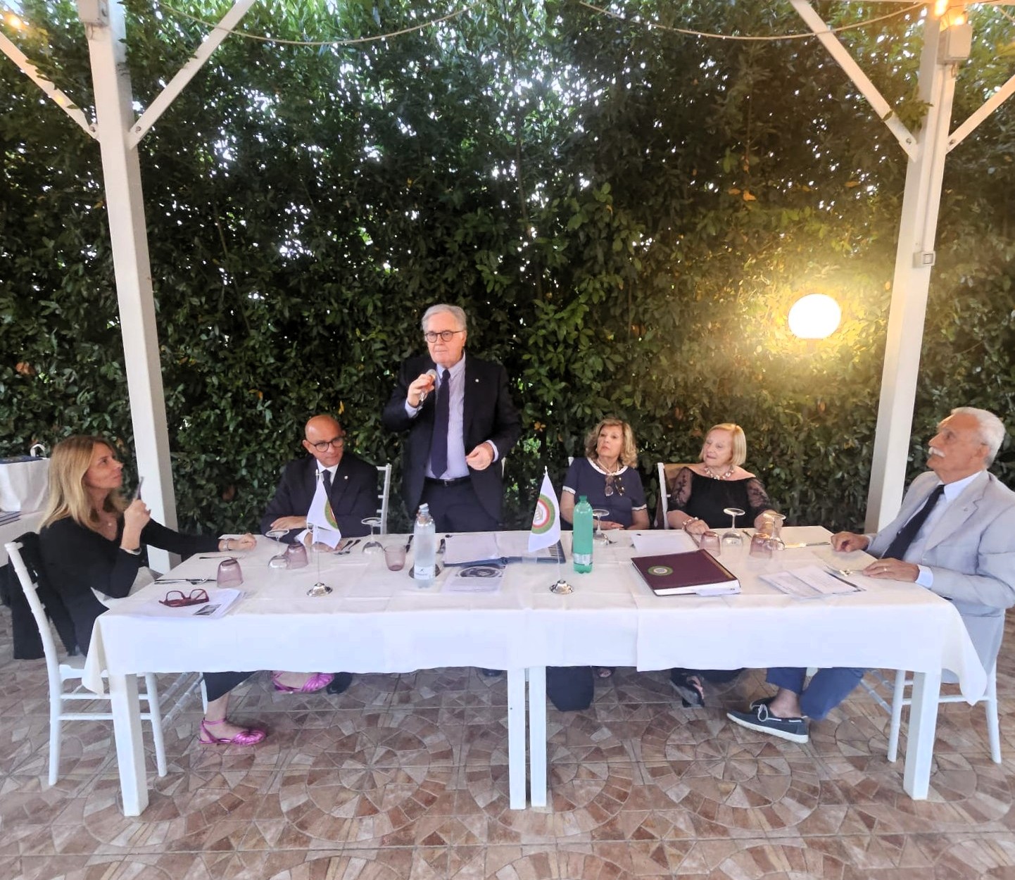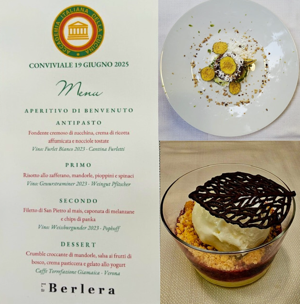 Partecipata e piacevole riunione conviviale della Delegazione di Rovereto e del Garda Trentino, tenutasi prima della pausa estiva presso il ristorante “La Berlera” a Riva del Garda. La serata ha avuto inizio con un aperitivo in giardino e la presentazione dell’incontro da parte della Simposiarca Nadia Bettini (foto 1). A seguire, i presenti hanno visitato gli interni della struttura che ospita il ristorante, accompagnati da una relazione sulla storia dell’antico maniero a cura della proprietaria, la dott.ssa Adriana Bonora. Successivamente, la cena è stata servita nel suggestivo giardino, introdotta dalla presentazione del menù e della famiglia che da alcuni anni gestisce il ristorante, a cura dell’altro Simposiarca, Claudio Malfer. Graditi ospiti: il Presidente del Tribunale di Rovereto, dott. Giulio Adilardi (nella foto 2 accanto al Delegato), il nuovo Sindaco di Riva del Garda, Alessio Zanoni, e il Presidente dell’APT Garda Dolomiti S.p.A., Silvio Rigatti (foto 3). Il menù è stato molto apprezzato, in particolare l’antipasto e il dessert (foto 4).