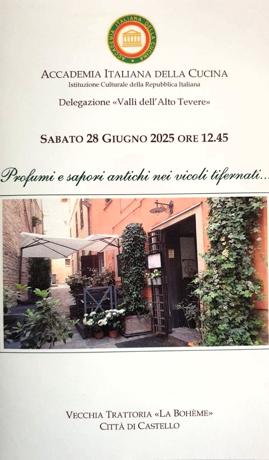 La scelta della riunione conviviale presso la Vecchia Trattoria "La Bohéme" di Città di Castello è stata una gradita sorpresa per tutti gli Accademici. Da tutti ricordata come la più vecchia trattoria che offriva in ogni momento della giornata la tradizionale "ciaccia calda" o "torta al testo", cotta al focolare sotto un coperchio ricoperto di brace, si presenta oggi completamente rinnovato: un ambiente curato, elegante, con tonalità soffuse, volte in mattoni, composizioni floreali e fruttate sui tavoli e un’accoglienza attenta e garbata da parte del proprietario, Sig. Sandro Castellani, e dei suoi collaboratori. Il nome del locale deriva da un ritrovamento nel muro, durante la ristrutturazione, del vecchio nome della trattoria e che ha origine dalla vicinanza con l’Antico Teatro Comunale, frequentato in passato da appassionati di lirica. La sorpresa, anche a tavola, nel susseguirsi di pietanze tradizionali del territorio eseguite perfettamente e giustamente dosate con prodotti rigorosamente del luogo e della stagione. Un esempio riuscito di rinnovamento che, pur aggiornando l’aspetto del locale, ha saputo conservare l’autenticità e lo spirito della vera trattoria.