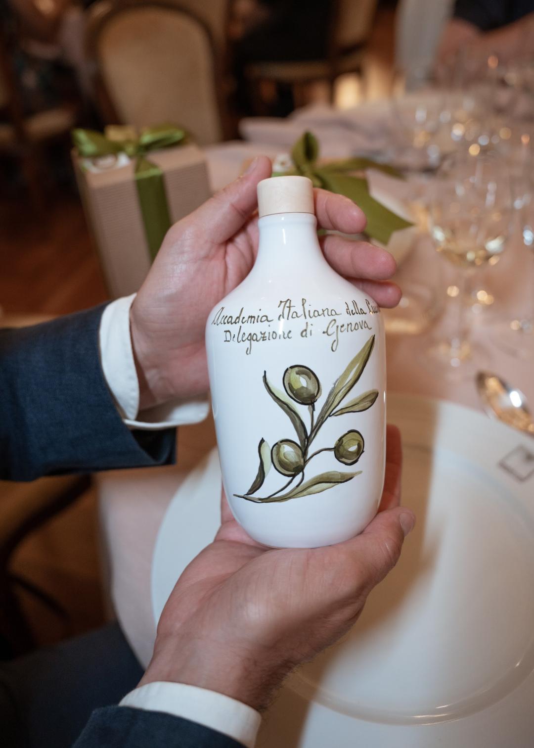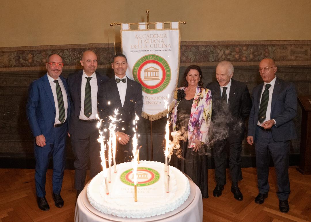 È stata una festa bellissima quella che, nella splendida cornice di Palazzo Grimaldi della Meridiana, ha celebrato i 70 anni della Delegazione di Genova con la tavola rotonda dal titolo “L’Oro della Liguria”. Un appuntamento pensato per omaggiare la lunga storia della Delegazione e per riflettere, attraverso il tema dell’olio extravergine ligure, sul legame tra tradizione, cultura gastronomica, paesaggio e innovazione. L’olio è stato il filo conduttore che ha unito interventi su cucina, storia, diritto, sostenibilità, produzione e nuove tecnologie. Un tema trasversale, scelto dal Delegato per rappresentare l’identità ligure e rendere omaggio anche alle altre Delegazioni della regione, tutte custodi di un patrimonio prezioso. A seguire, il Delegato Manuel Macrì e la Consulta al completo hanno accolto Accademici, Delegati, Membri del Consiglio di Presidenza e della Consulta Accademica alla cena di gala, svoltasi nel salone con le volte affrescate dal pittore cinquecentesco Luca Cambiaso. Durante la serata, l’Accademico Valentino Bottari ha ricevuto la targa e il distintivo per i suoi 40 anni di appartenenza all’Associazione. In ricordo dei 70 anni della Delegazione di Genova, è stata consegnata a tutti i partecipanti un’oliera in ceramica dipinta a mano, realizzata appositamente per la ricorrenza.