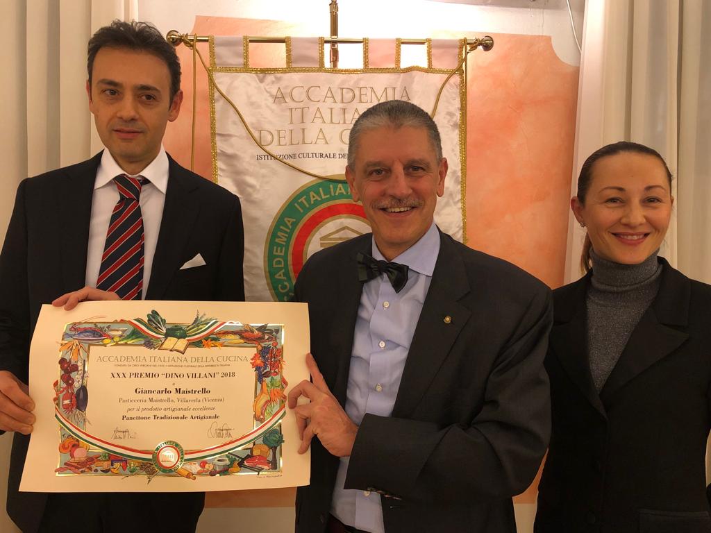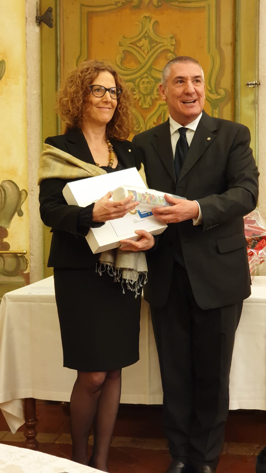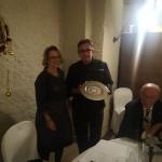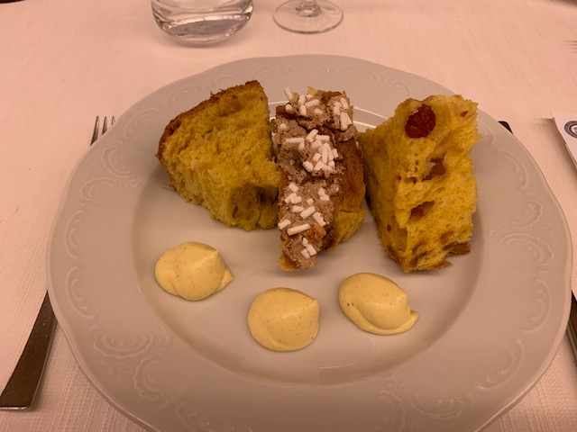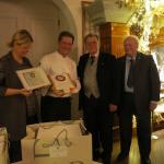 La Delegazione dell'Alto Vicentino si è riunita, in occasione della riunione conviviale degli auguri, presso il ristorante "Da Riccardo" a Carrè. Foto 1: il Delegato Renzo Rizzi consegna il Premio "Dino Villani" a Giancarlo Maistrello e alla sorella Marta. Foto 2: il Delegato e il Simposiarca con lo staff del locale. Foto 3: catalana di code di scampi e gamberi. Foto 4: fetta di panettone con crema chantilly.