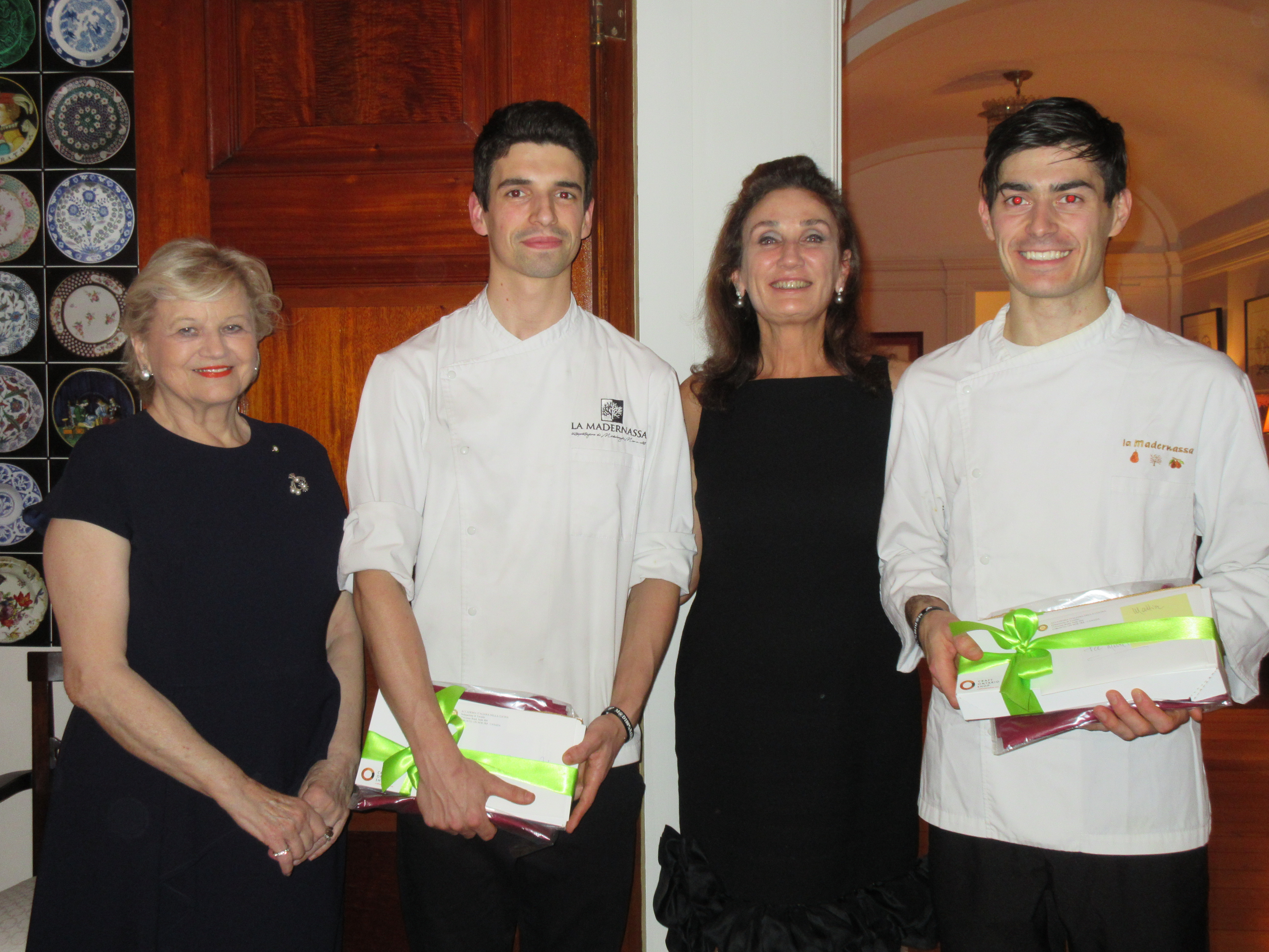 Anche gli eventi che si sono tenuti a Ottawa in occasione della "Settimana" sono stati di grande successo. Con la collaborazione dell'Ambasciata, dell'Istituto di Cultura e ICE, le Delegazioni dell'Accademia di Toronto e Alba-Langhe hanno dato grande valenza ai prodotti di qualità della Regione Piemonte e di altre località italiane. Gli eventi si sono svolti nella sede dell'Ambasciata d'italia a Ottawa. Foto 1 (da sinistra): Marisa Bergagnini Delegata di Toronto, Tino Cornaglia Delegato di Alba-Langhe, Ambasciatore Claudio Taffuri e consorte Maria Enrica Taffuri, Accademico di Alba Fabrizio Ventura. Foto 2: Delegata Marisa Bergagnini, Mattia Fracchia (cuoco), signora Maria Enrica Taffuri, Cristian Bianco (cuoco). Foto 3: la tavola allestita nella residenza dell'Ambasciatore. Foto 4: presente in tavola il tartufo Bianco d'Alba.