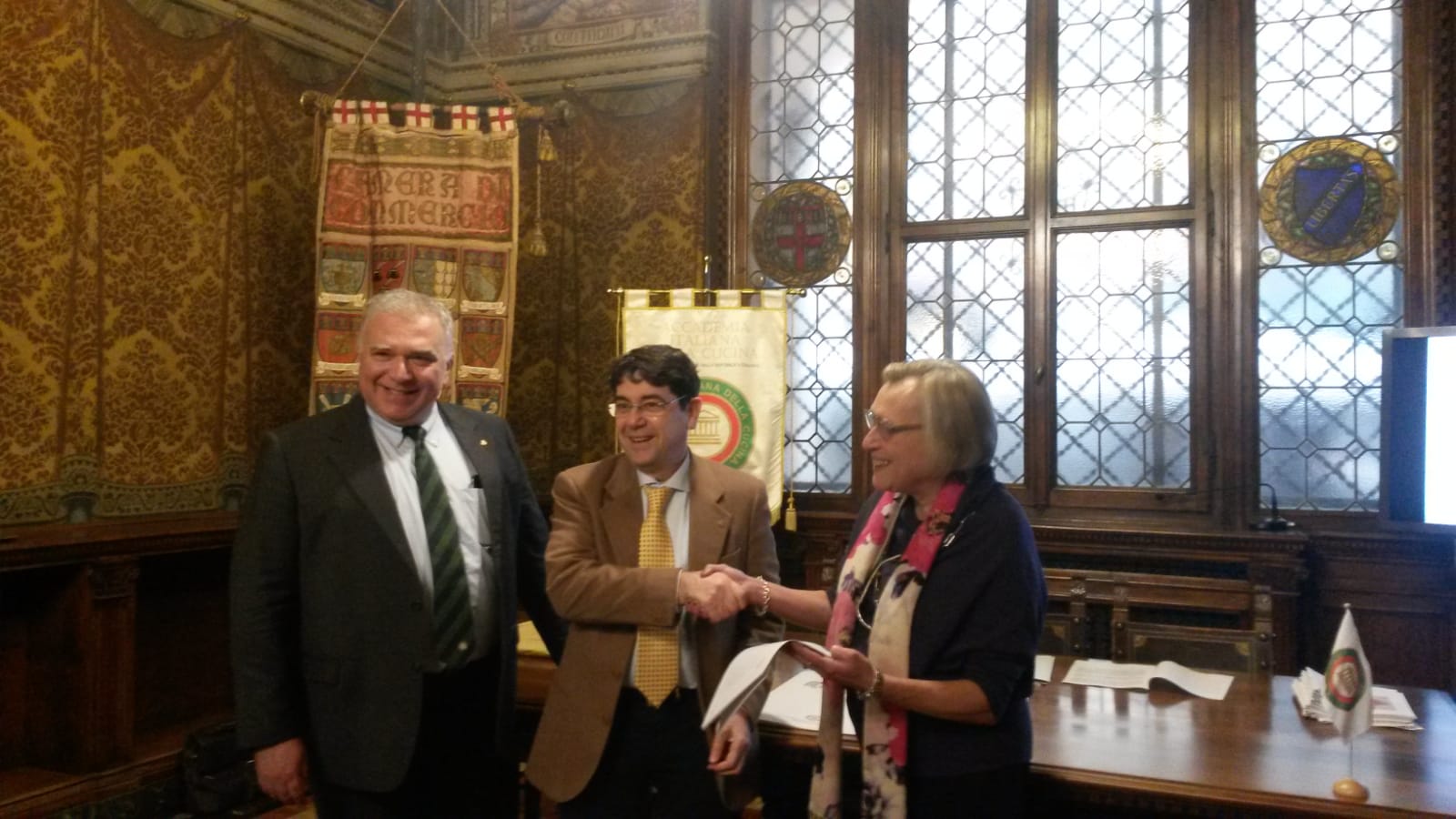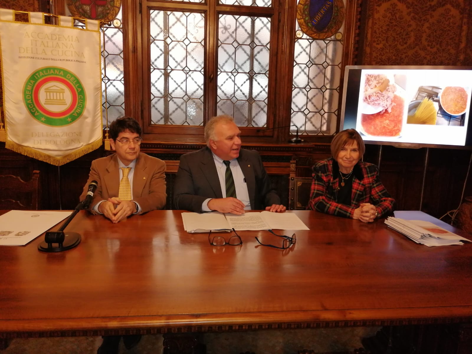 E' avvenuta il 14 dicembre scorso, presso la Camera di Commercio bolognese, la cerimonia di deposito della ricetta degli "spaghetti con il tonno", a cura della Delegazione di Bologna dell'Accademia Italiana della Cucina. Dopo gli interventi ufficiali del Delegato Guido Mascioli e del Segretario Generale della CCIA Giada Grandi alla presenza del notaio Elia Antonacci (foto 1, da sinistra Guido Mascioli, Elia Antonacci, Giada Grandi), la Vice Delegata Cristina Bragaglia ha ricostruito la storia della ricetta grazie ai risultati di una ricerca storica condotta dagli Accademici di Bologna. Hanno poi preso la parola i rappresentanti di associazioni che hanno voluto accompagnare il cammino di recupero e registrazione del piatto. Foto 2 (da sinistra): notaio Elia Antonacci, Delegato Guido Mascioli, Vice Delegata Cristina Bragaglia.