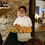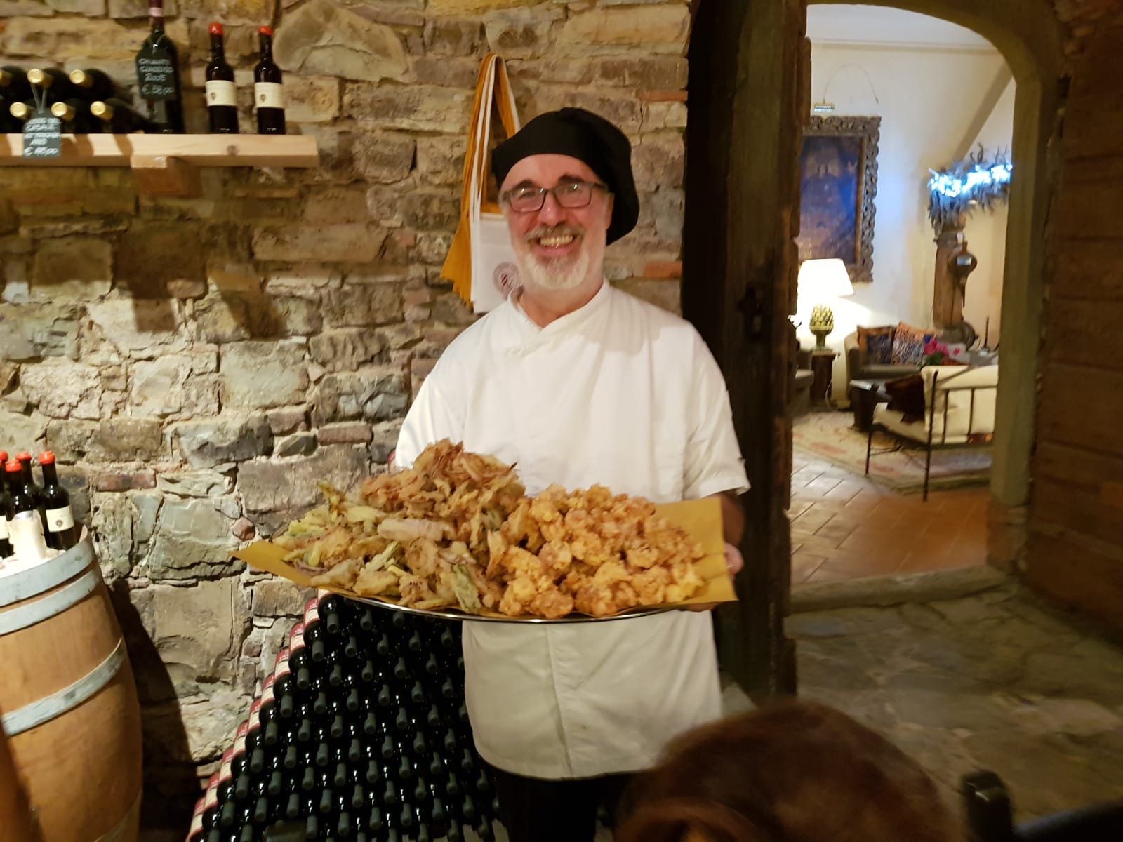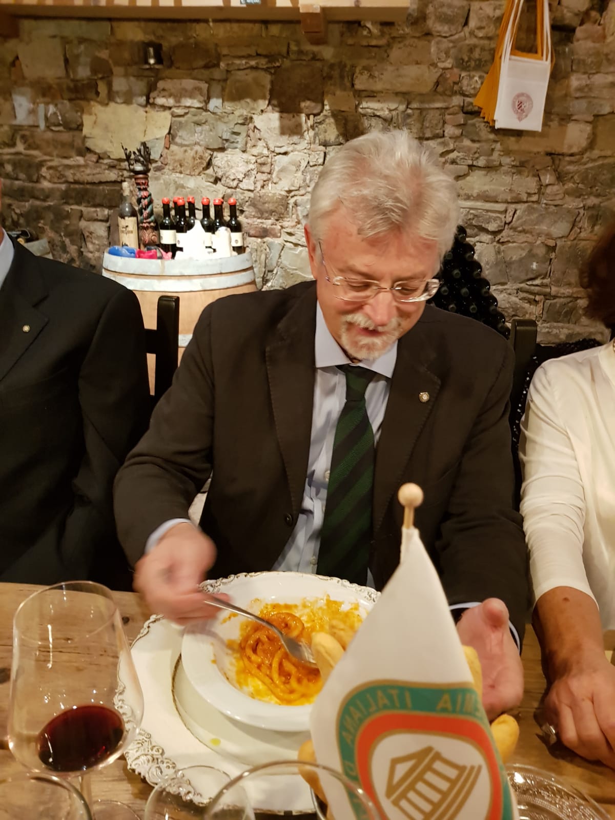 La Delegazione di Valdarno Fiorentino si è riunita presso l' "Agriturismo Terre di Baccio" a Greve in Chianti in occasione della riunione conviviale. Foto 1: il Delegato Ruggero Larco assaggia i "pici all'aglione". Foto 2: il gran fritto toscano. Foto 3: la tavola.