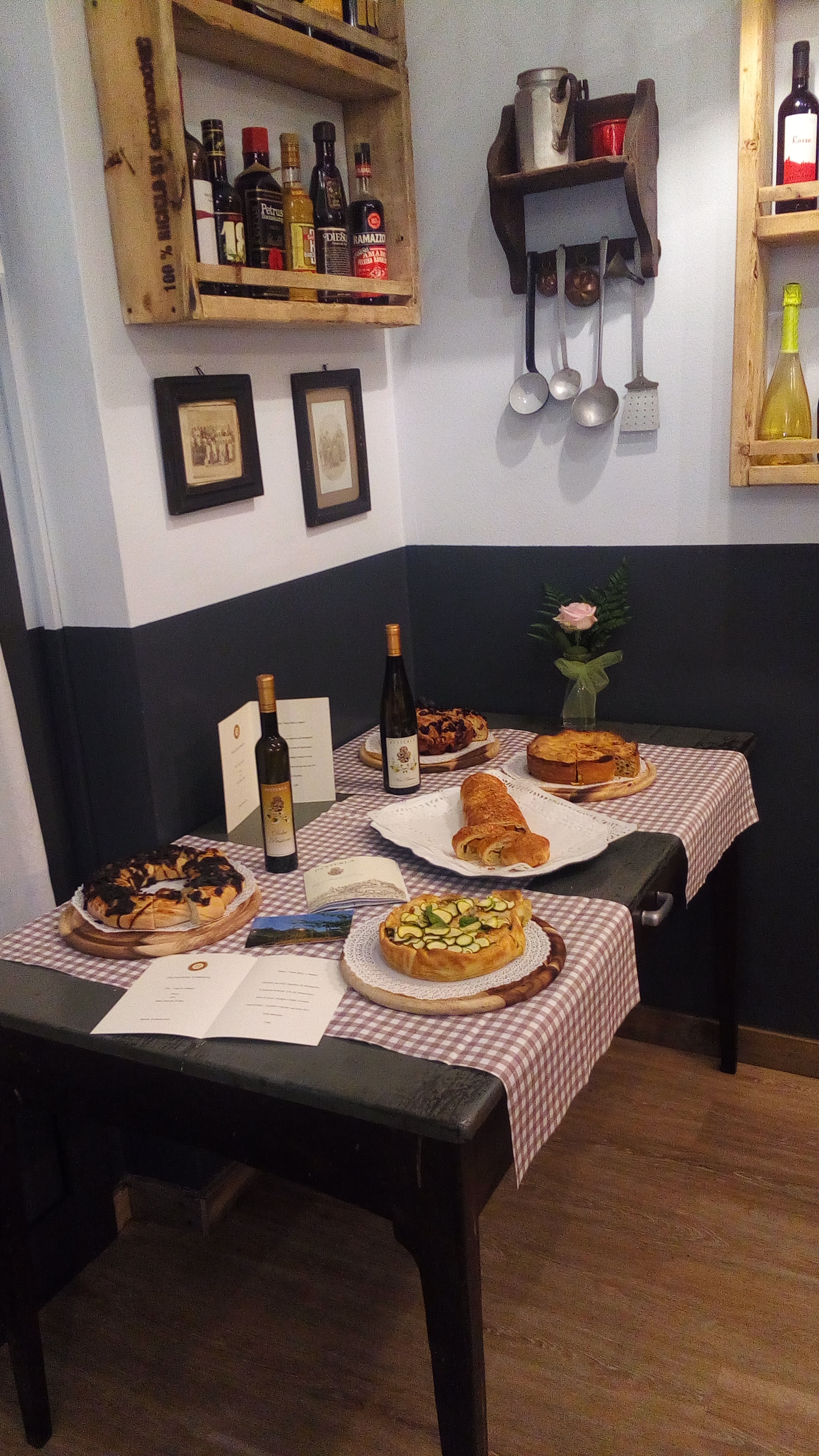 La Delegazione di Belluno-Feltre-Cadore si è riunita presso il ristorante "Al Borgo" di Belluno per celebrare la cena ecumenica. Foto 1: Il Delegato Brenno del Pont con lo staff del ristorante. Foto 2: torta ai formaggi e torta di fagioli.