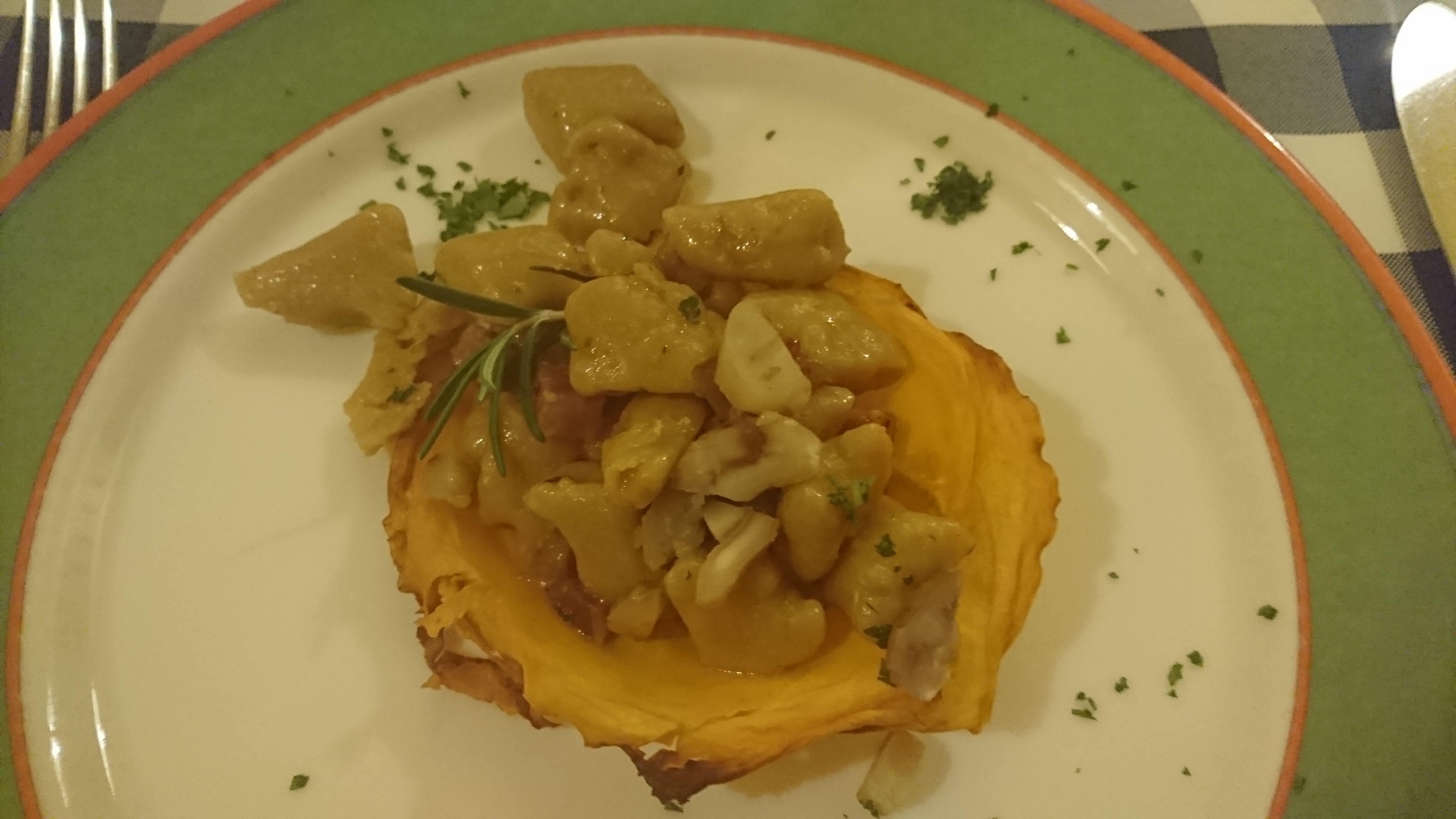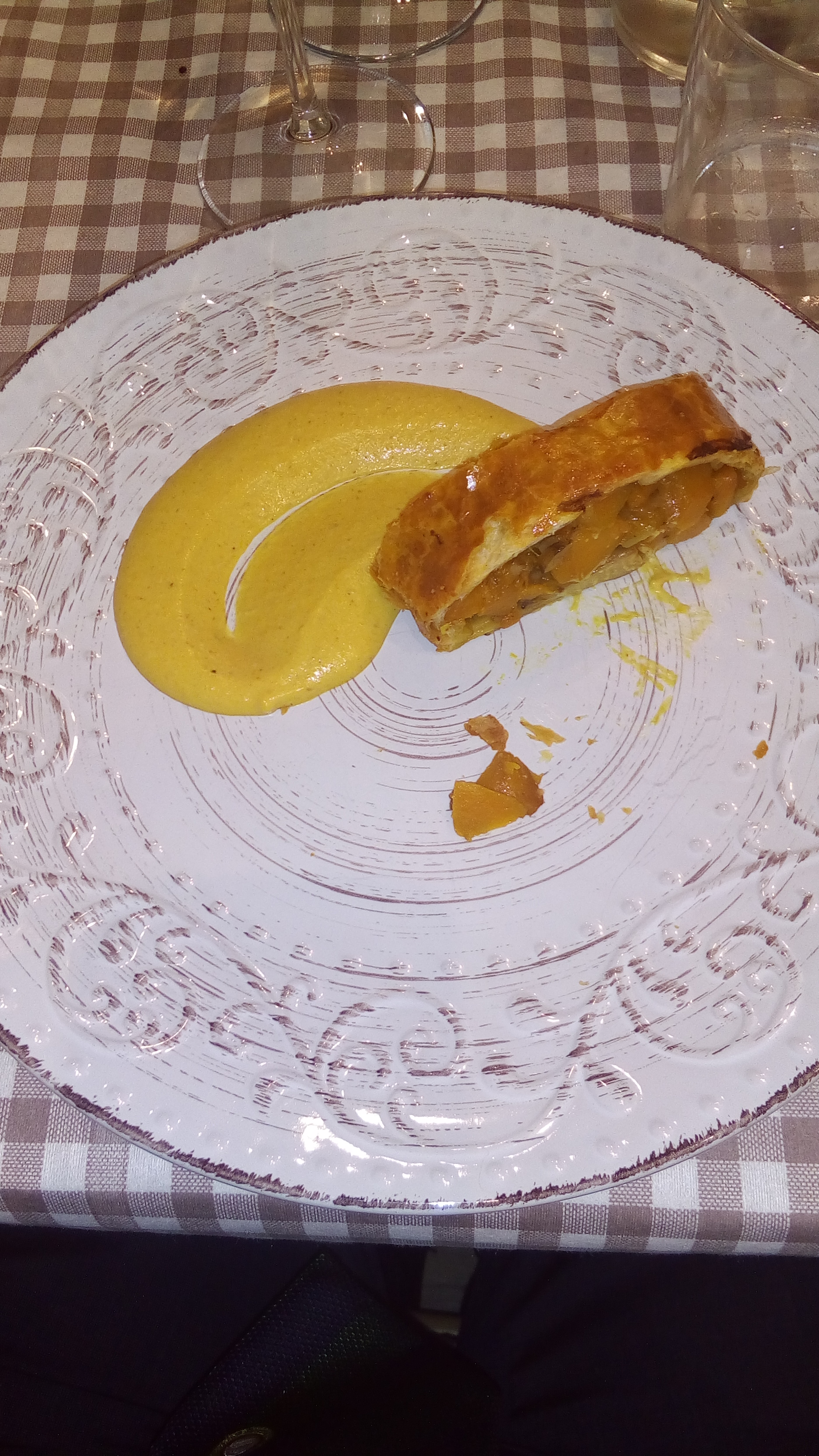La Delegazione di Biella si è riunita, in occasione della cena ecumenica, presso il ristorante "La Taverna del Gufo" a Occhieppo Inferiore. Foto 1 (da destra): la Delegata Maria Luisa Bertotto e la cuoca Stefania Borgato. Foto 2: antipasto artoclee, torta di mascarpin, turtella e potage di verdure. Foto 3: gnocchi di zucca e castagne con lardo, salam dl'ula, aglio, rosmarino e prezzemolo.
