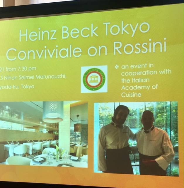 Per la "Settimana", la Legazione di Tokyo ha voluto ricordare i 150 anni dalla scomparsa del maestro Rossini, con una cena a tema, il 20 novembre presso il ristorante Heinz Beck Tokyo (foto 1). Foto 2: Emanuela Orighi Legata, Giuseppe Molaro executive chef , Masakatsu Ikeda giornalista. Il 21 novembre, con il Patrocinio dell’Ambasciata Italiana, il Patrocinio Nominale del Trade Promotion Section dell’Ambasciata si è svolto un seminario sulla storia del Gelato con il contributo dell'Accademico Lorenzo Scrimizzi (foto 3). Il tradizionale Gran Concorso di Cucina, organizzato dalla Camera di Commercio Italiana a Tokyo, svoltosi il 22 novembre, ha visto la partecipazione, quale membro di giuria, della Legata Emanuela Orighi. Il Concorso è riservato a giovani chef giapponesi di cucina italiana (foto 4).