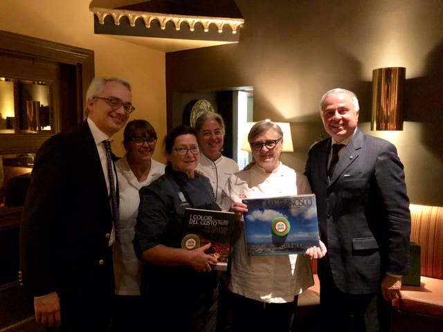 La Delegazione di San Francisco ha selezionato 25 ristoranti, della regione della Baia, che hanno aderito con entusiasmo alla “Settimana” promossa dal Consolato Italiano. Foto 1: visita al Culinary Institute of America (da sinistra): Paolo Colavita, Roberta Magistà, Darrell Corti, Orietta Gianjorio ex Delegata, Lorenzo Ortona Console Generale e Accademico Onorario, Maria Cicorella e Claudio Tarchi Delegato. Foto 2: (da sinistra) Lorenzo Ortona, Roberta Magistà, Suzette Gresham , Viola Buitoni ex Delegata, Maria Cicorella, Claudio Tarchi Delegato e gli omaggi in ricordo della splendida serata. Foto 3: uno scorcio del ristorante "Acquerello" presso il quale si è tenuta la cena. Foto 4: Claudio Tarchi con Shelly Lindgren.