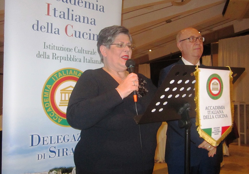 La Delegazione di Siracusa si è riunita presso il ristorante "Il Faraone" in occasione di una riunione conviviale. Foto 1: il Delegato Angelo Tamburini e Gioia Pace Presidente della "Dante Alighieri" di Siracusa. Foto 2: il Delegato con la Simposiarca Carla Siena che presenta la relazione "Il Cibo nella Pubblicità". Foto 3: Accademici a tavola. Foto 4: turbante di orata al profumo d'arancia.