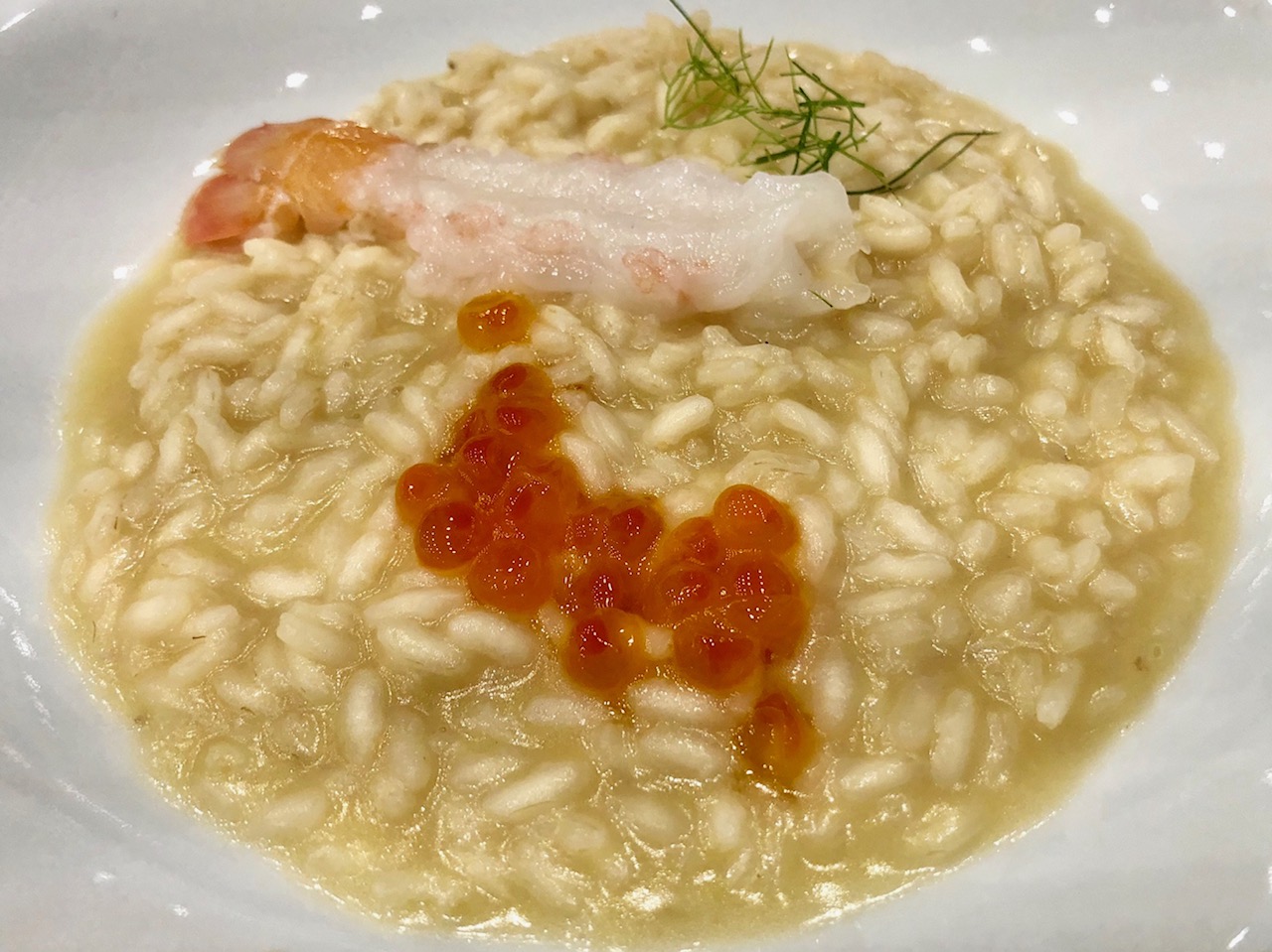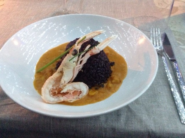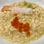 La Delegazione di Novara si è riunita per la riunione conviviale d’estate al ristorante "Antico Verbano" di Meina. Foto 1: al centro il Delegato Piero Spaini insieme a due neo Accademiche Anita Ticozzi ed Eleonora Dell’Acqua. Foto 2: risotto “Goio“ con gamberi crudi di Sicilia e profumo di lime.