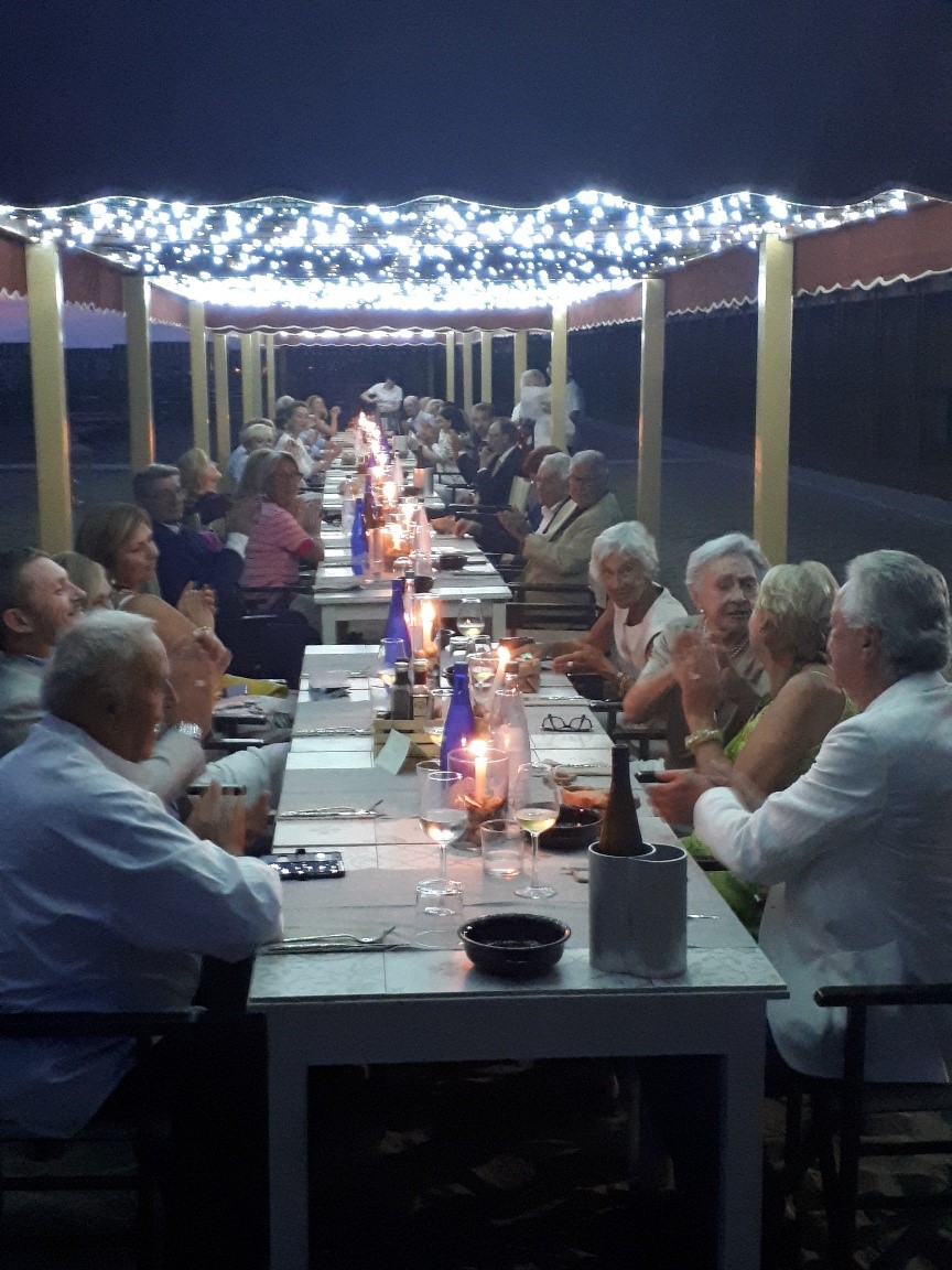 La Delegazione della Versilia Storica si è riunita presso il ristorante "Bagno Apuana" a Forte dei Marmi in occasione della riunione conviviale. Foto 1: la Delegata Anna Ricci Pinucci saluta l'ospite Emilio Petrini Mansi Marchese, Presidente del Lions Club. Foto 2: la Delegata in compagnia di Monica Sforzini (Delegata del Mugello), Massimo Vincenzini (Delegato di Empoli) e il Vice Delegato della Versilia Storica Roberto Bertola. Foto 3: la Delegata, il Vice Delegato e la brigata di cucina a cui sono stati consegnati volumi e riviste dell'Accademia come ringraziamento per una bella serata all'insegna di buona cucina e convivialità. Foto 4: la lunga tavola in riva al mare in una notte magica di eclissi di luna. Foto 5: savarin di riso venere con scampi.