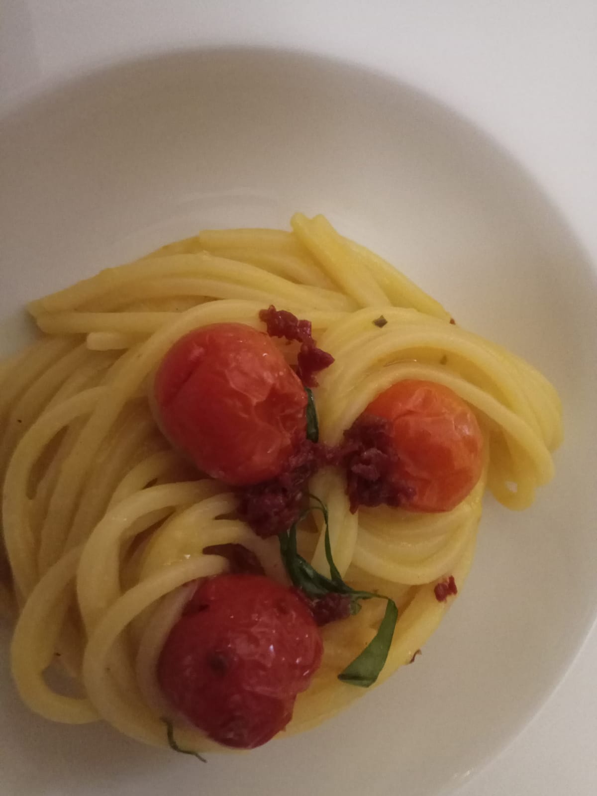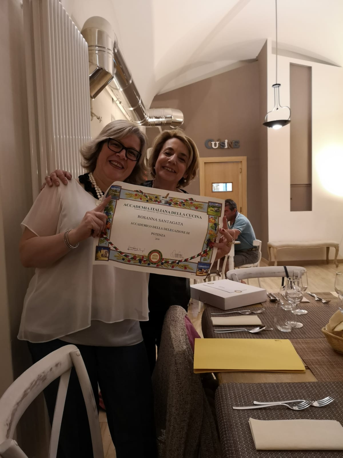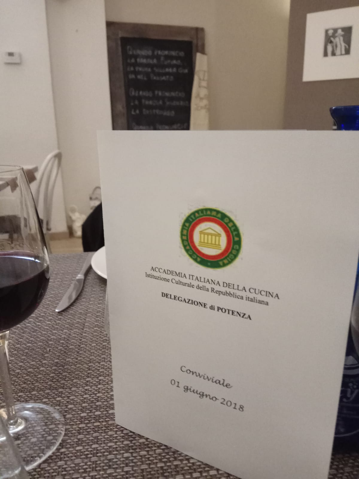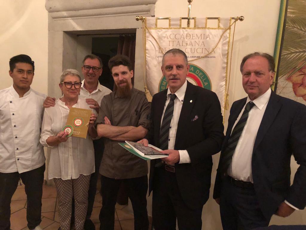 Riunione conviviale della Delegazione di Potenza. Foto 1: consegna del diploma dell'Accademia alla neo Accademica Rosanna Santagata. Foto 2: la Delegata Anna Paola Vergari, Antonio Masella, la titolare del ristorante e lo chef. Foto 3: una foto del menu della serata. Foto 4: mousse di ricotta, dolce preparato in occasione della serata. Foto 5: un piatto del menu della serata: spaghettoni ai tre pomodori. Foto 6: consegna della vetrofania alla titolare e allo chef.