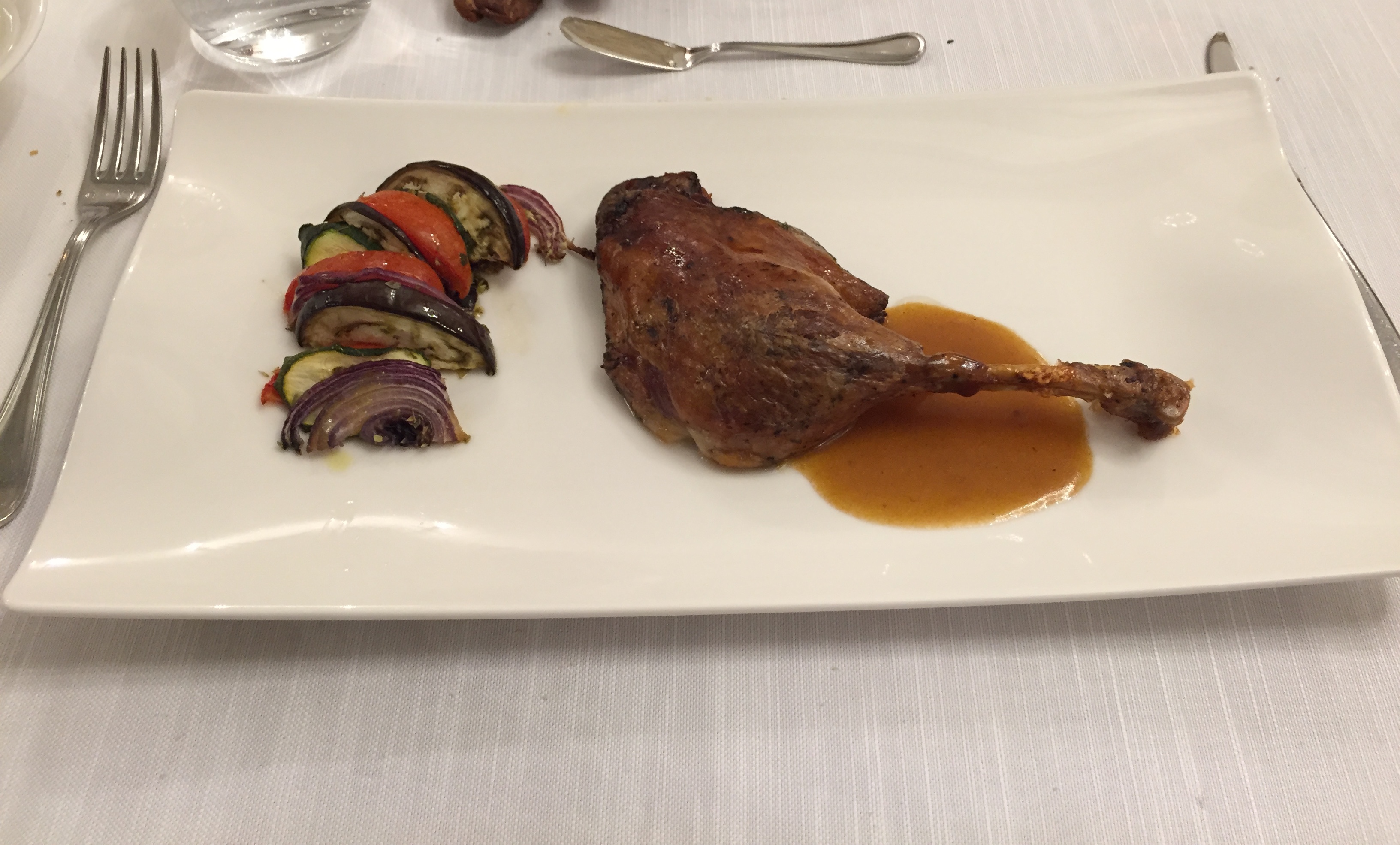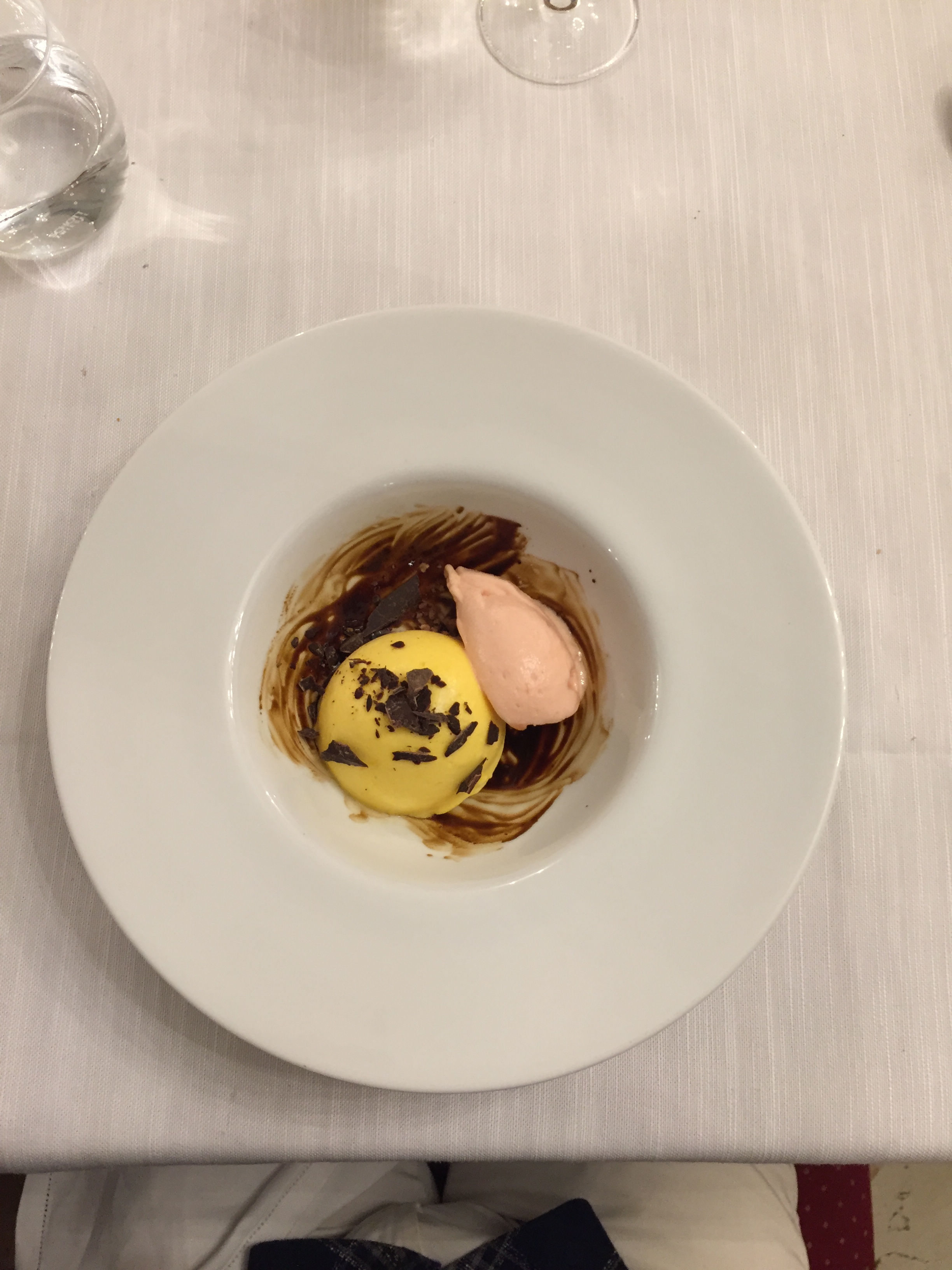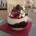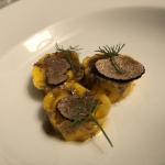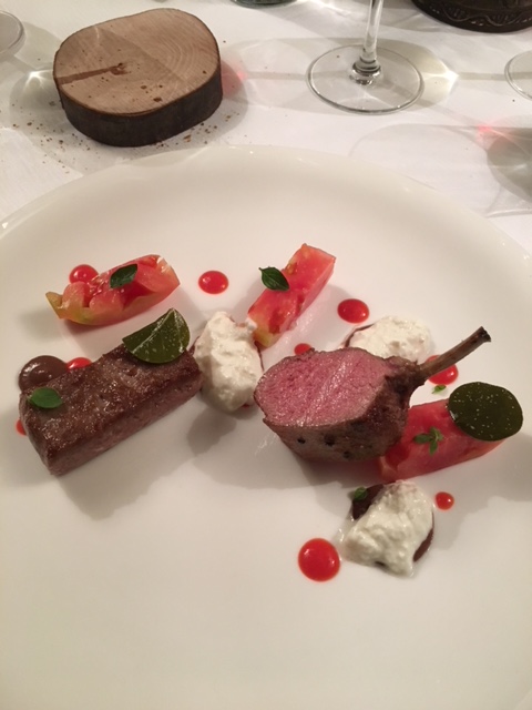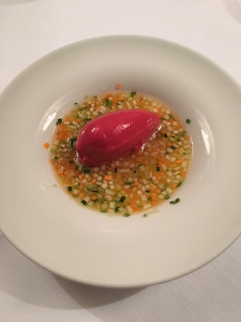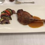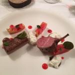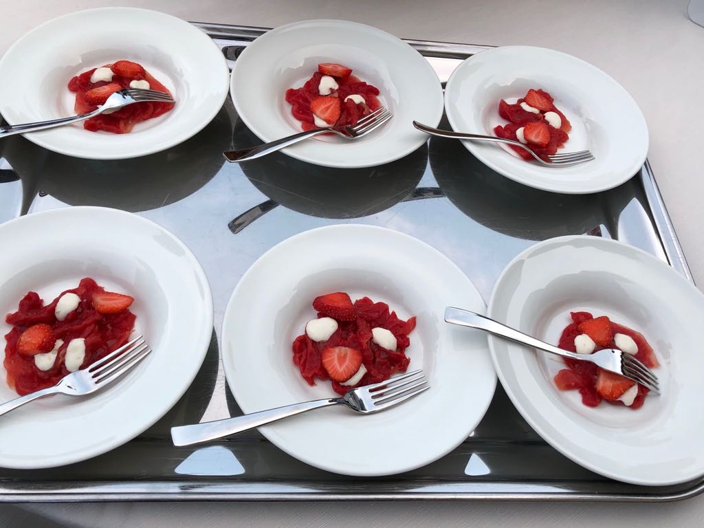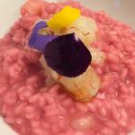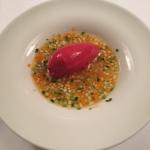 La Delegazione dei Colli Euganei - Basso Padovano si è riunita per la riunione conviviale. Foto 1: il Delegato, Pietro Fracanzani, con la cuoca Silvia Moro, il fratello Aldo e le brigate di cucina e di sala. Foto 2: risotto ai fiori con barbabietola e gamberi. Foto 3: coscia d'oca in confit con millefoglie di verdure. Foto 4: mousse al limone con liquirizia e gelato al pompelmo.