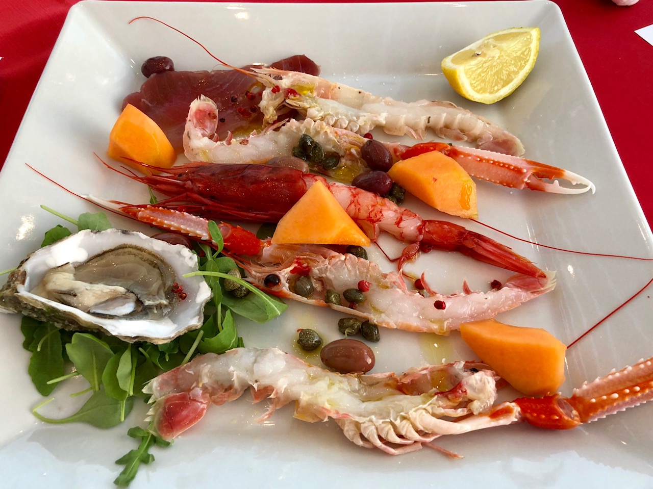 La Delegazione di Siracusa si è riunita presso il ristorante "Onda Blu" in occasione della riunione conviviale. Foto 1: il Delegato Angelo Tamburini espone brevemente "Cultura della Tavola e materie prime in AIC". Foto 2: a sinistra il Maître Massimo Risita, il Delegato Angelo Tamburini consegna guidoncino e vetrofania dell'Accademia alla proprietaria Simona Serra e allo chef Mongi Nasri. Foto 3: antipasto Onda Blu. Foto 4: Semifreddo alla mandorla di Avola.