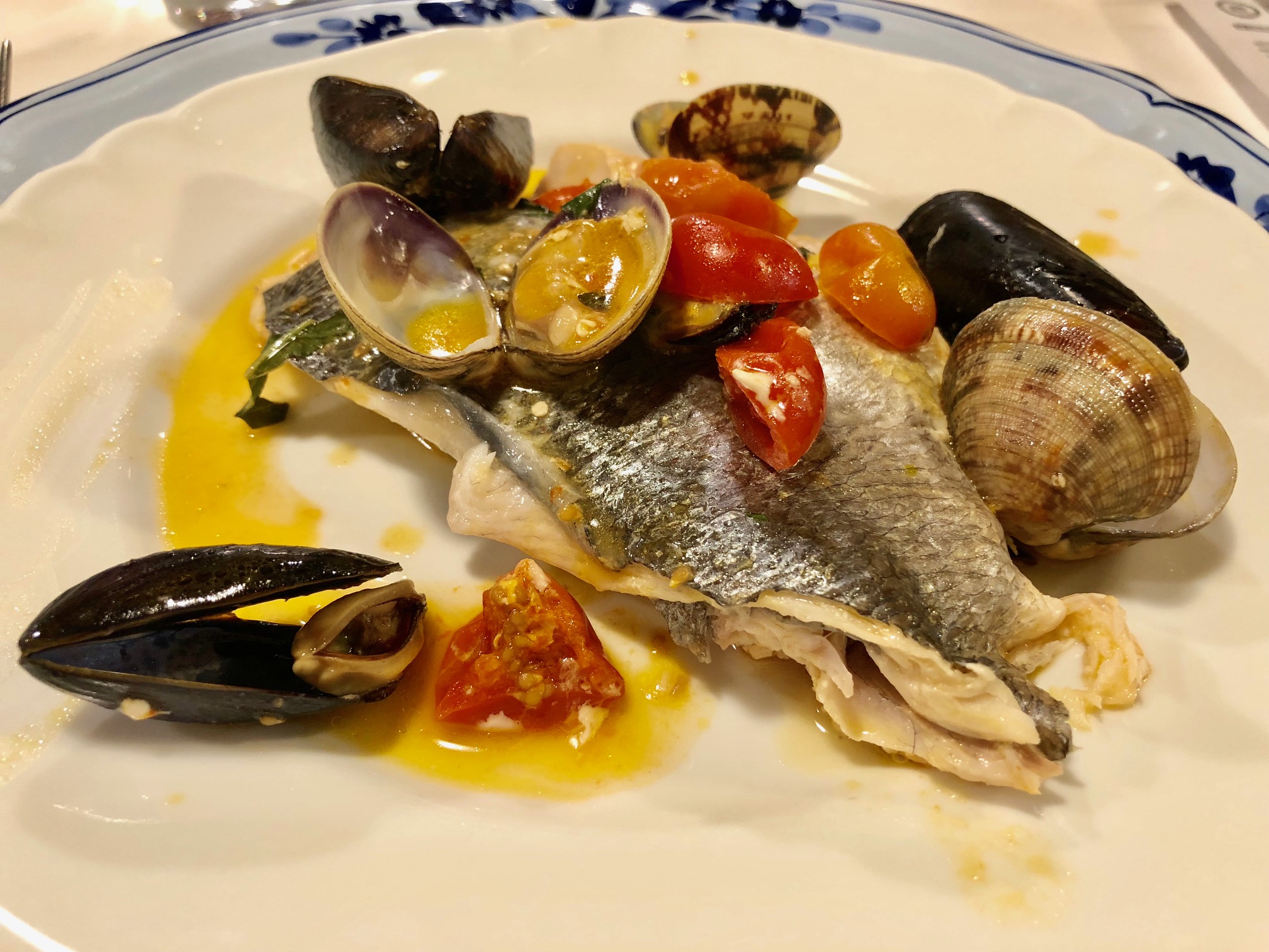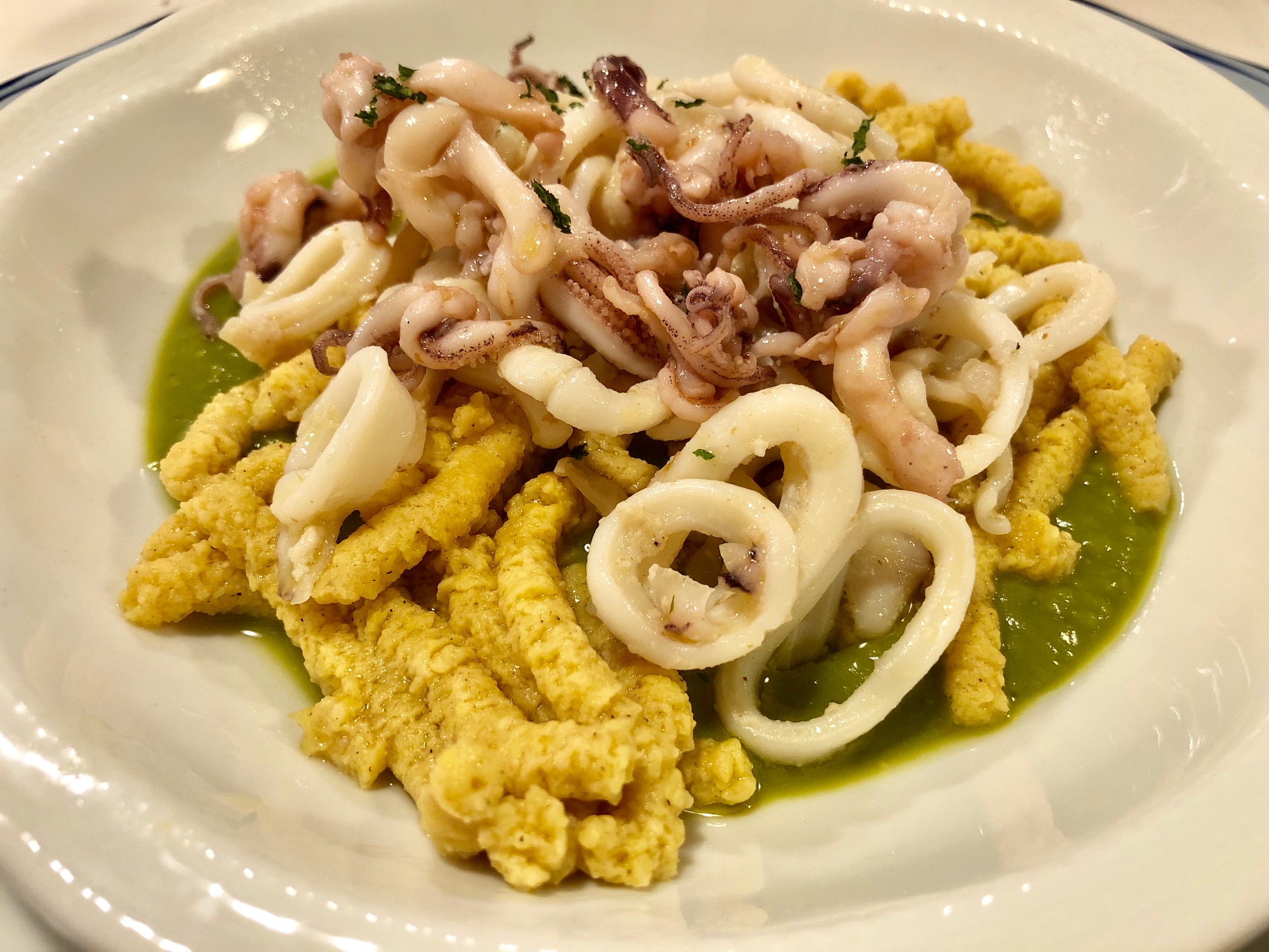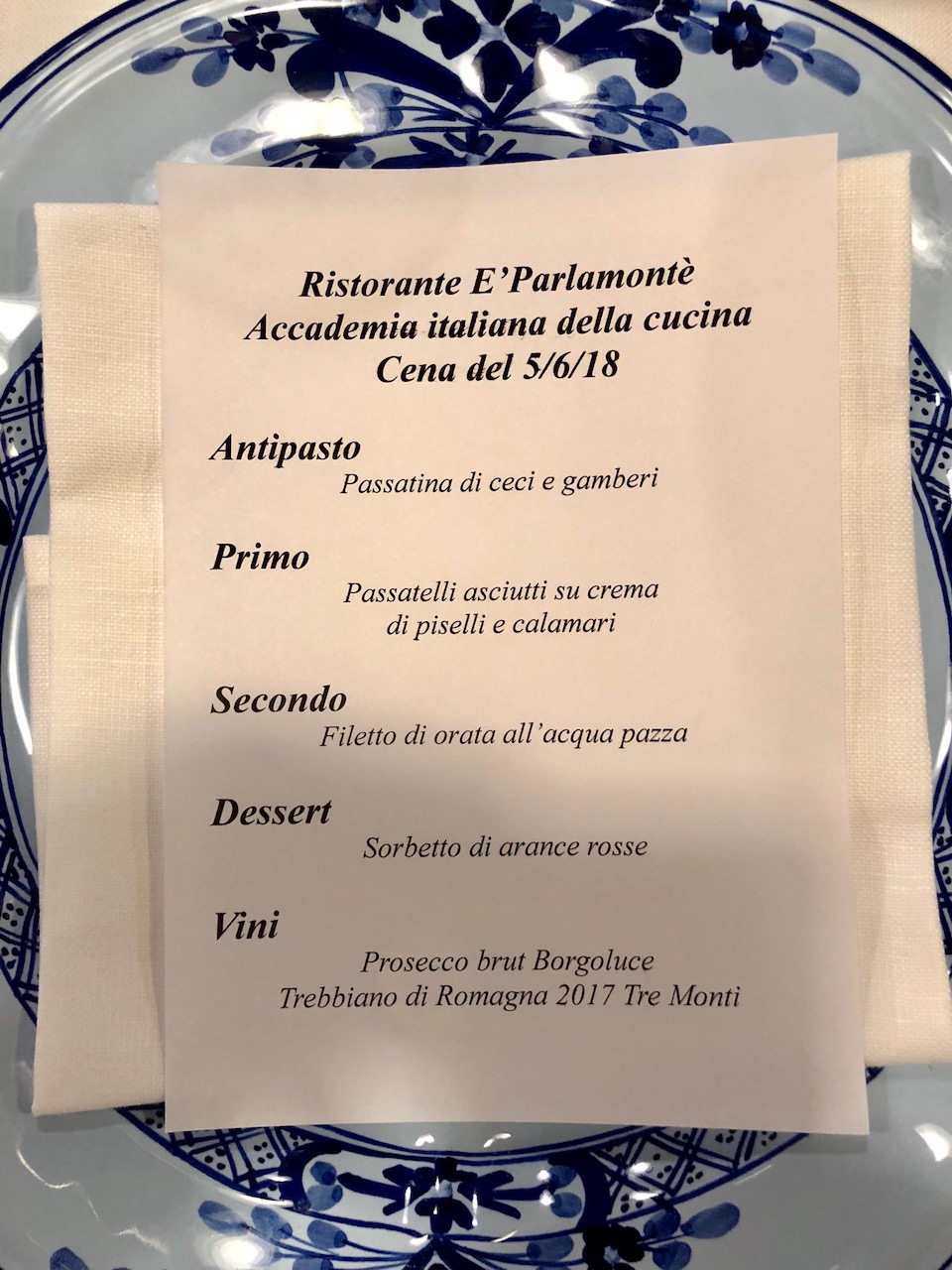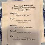 La riunione conviviale della Delegazione di Imola si è svolta presso il ristorante "E Parlamintè". Foto 1: menu della serata. Foto 2: La brigata di cucina con il capofamiglia Raffaele, la moglie Marta, il figlio Raffaele e il Delegato Antonio Gaddoni. Foto 3: passatina di ceci e gamberi. Foto 4: passatelli asciutti su crema di piselli e calamari. Foto 5: filetto di orata all'acqua pazza. Foto 6: sorbetto di arance rosse.