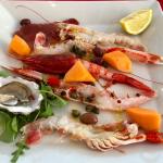 La Delegazione di Imola, in occasione della riunione conviviale, si è riunita presso il ristorante "L'Artigiano". Foto 1: gli Accademici con la brigata di cucina. Foto 2: consegna del guidoncino dell'Accademia Italiana della Cucina. Foto 3: crudità di mare. Foto 4: risotto allo scampo mantecato allo champagne.