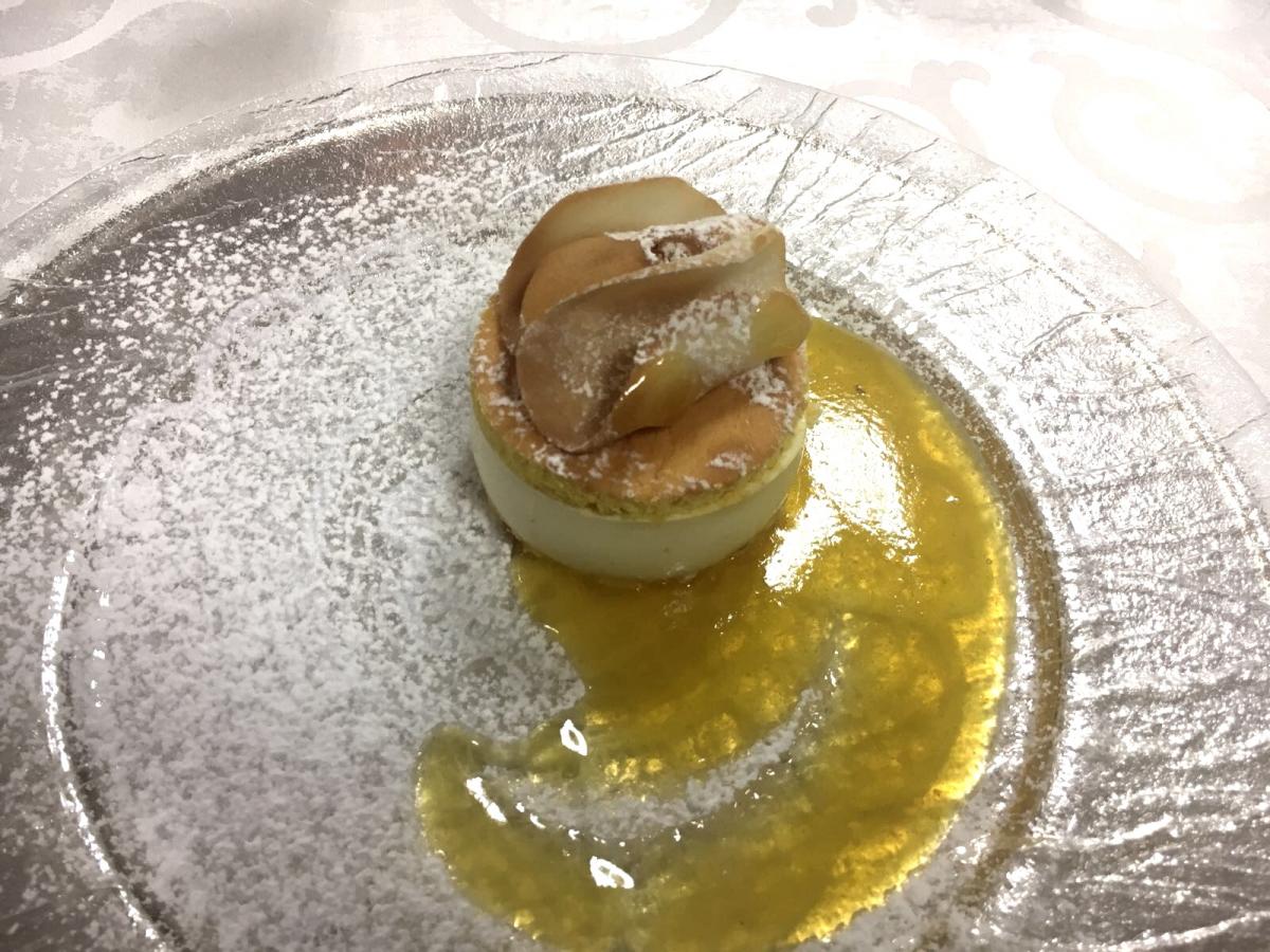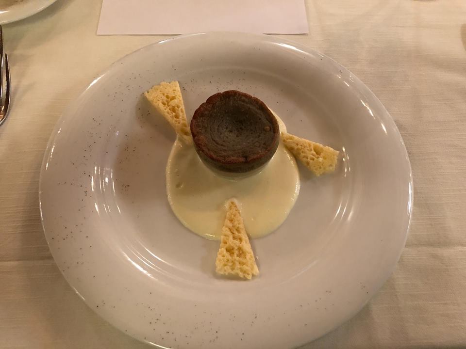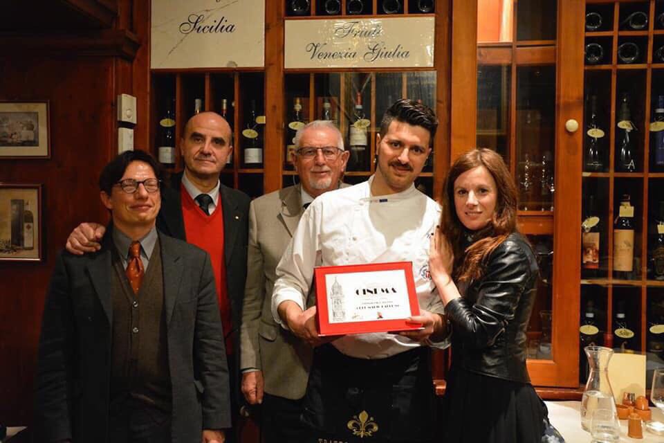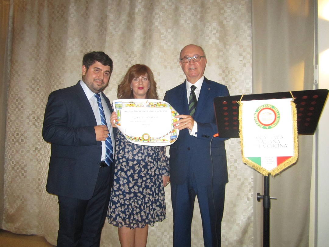 La cena ecumenica per la Delegazione di Siracusa si è tenuta presso il ristorante "Eduardo dell'Hotel Parco delle Fontane". Foto 1: il Delegato Angelo Tamburini (ultimo a destra) consegna l'Attestato Accademico a Gabriele Carnemolla, nuovo Accademico. Foto 2: Il Delegato Angelo Tamburini consegna il guidoncino e la vetrofania all'executive chef Vincenzo Lunetta. Foto 3: Accademici a tavola. Foto 4: Menu della cena. Foto 5: aperitivo: formaggi siciliani e piccoli sfizi dello chef presentati su una grande Sicilia. Foto 6: ravioli di ricotta iblea erborinata al sentore di coriandolo. foto 7: sformatino di ragusano Dop stagionato su crema di ceci. Foto 8: tagliatina di frutta. Foto 9: dessert d'autunno (crema di nocciole, ricotta e castagne).