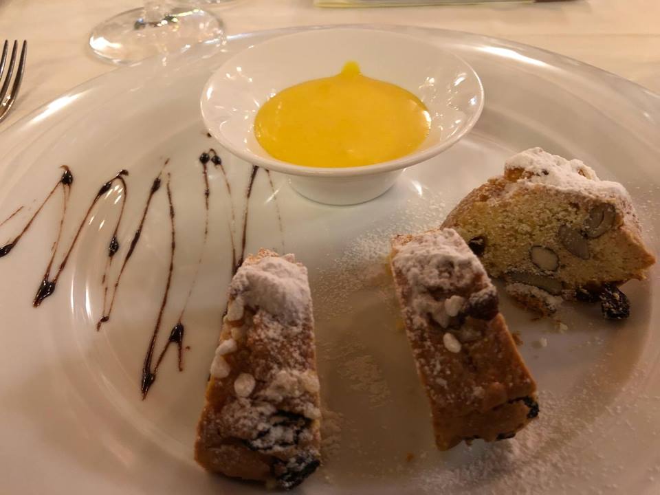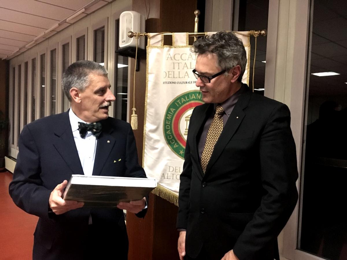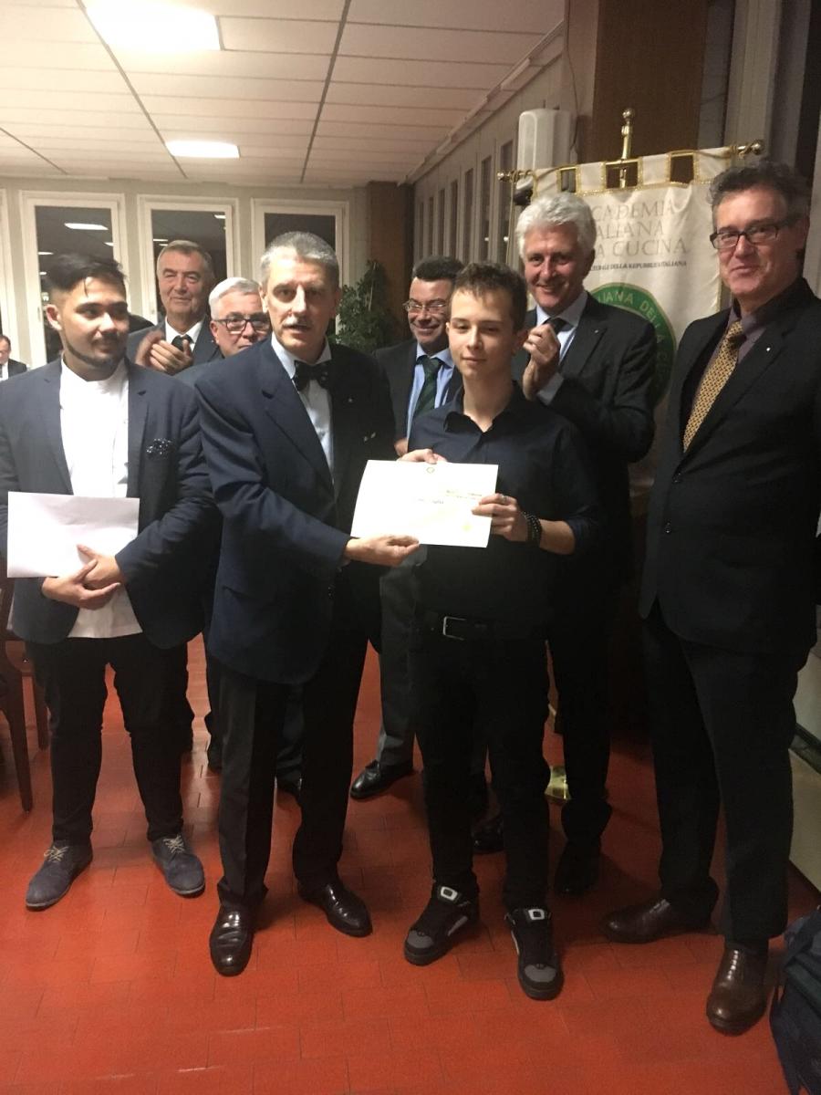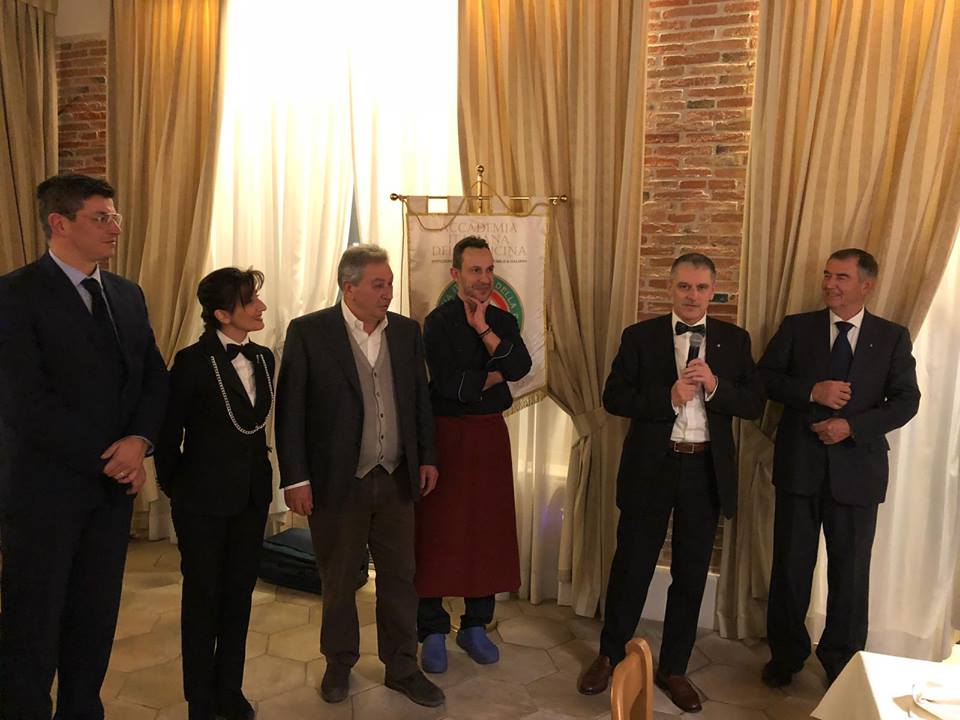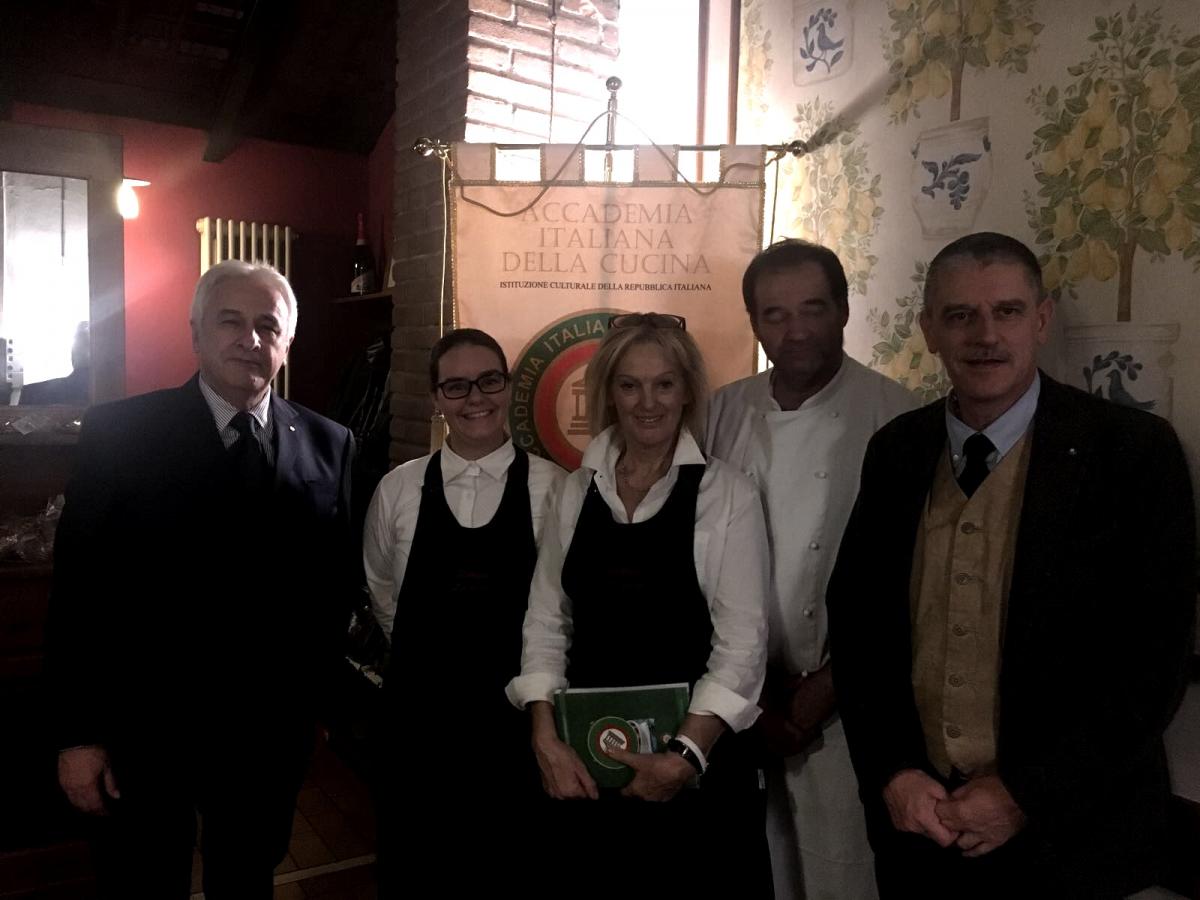 Riunione conviviale d'autunno dedicata alla consegna del Premio "Massimo Alberini" presso l'Enoteca La Corte di Cornedo Vicentino (Vicenza). Foto1: il Delegato Renzo Rizzi consegna il Premio "MassimoAlberini" al panificio Federico Rossi. Foto2: dolci "brasadeli" prodotti dal sig. Rossi. Foto 3: da sinistra il Simposiarca, lo staff del locale con il cuoco ed il Delegato Renzo Rizzi. Foto 4: tavolo con alcuni commensali e il Delegato. Foto 5: il Simposiarca spiega il menù ed i vini in abbinamento. Foto 6: Accademici a tavola.