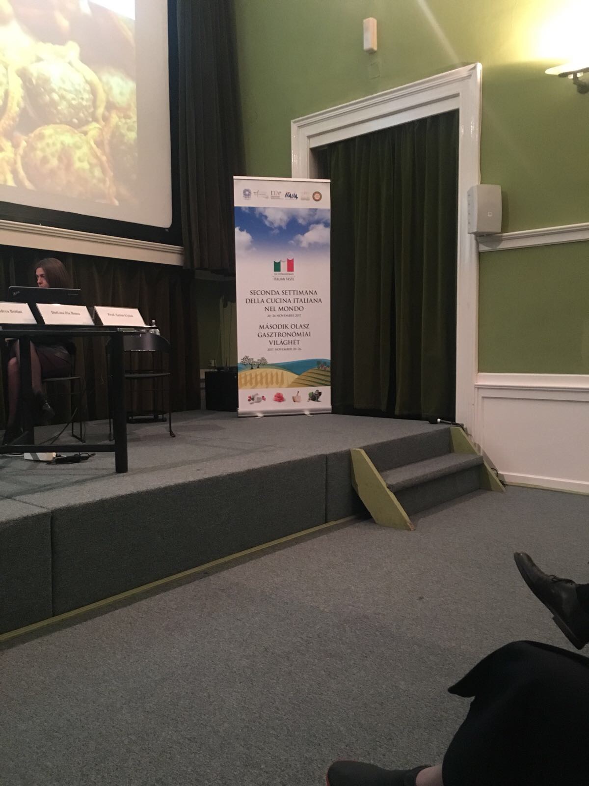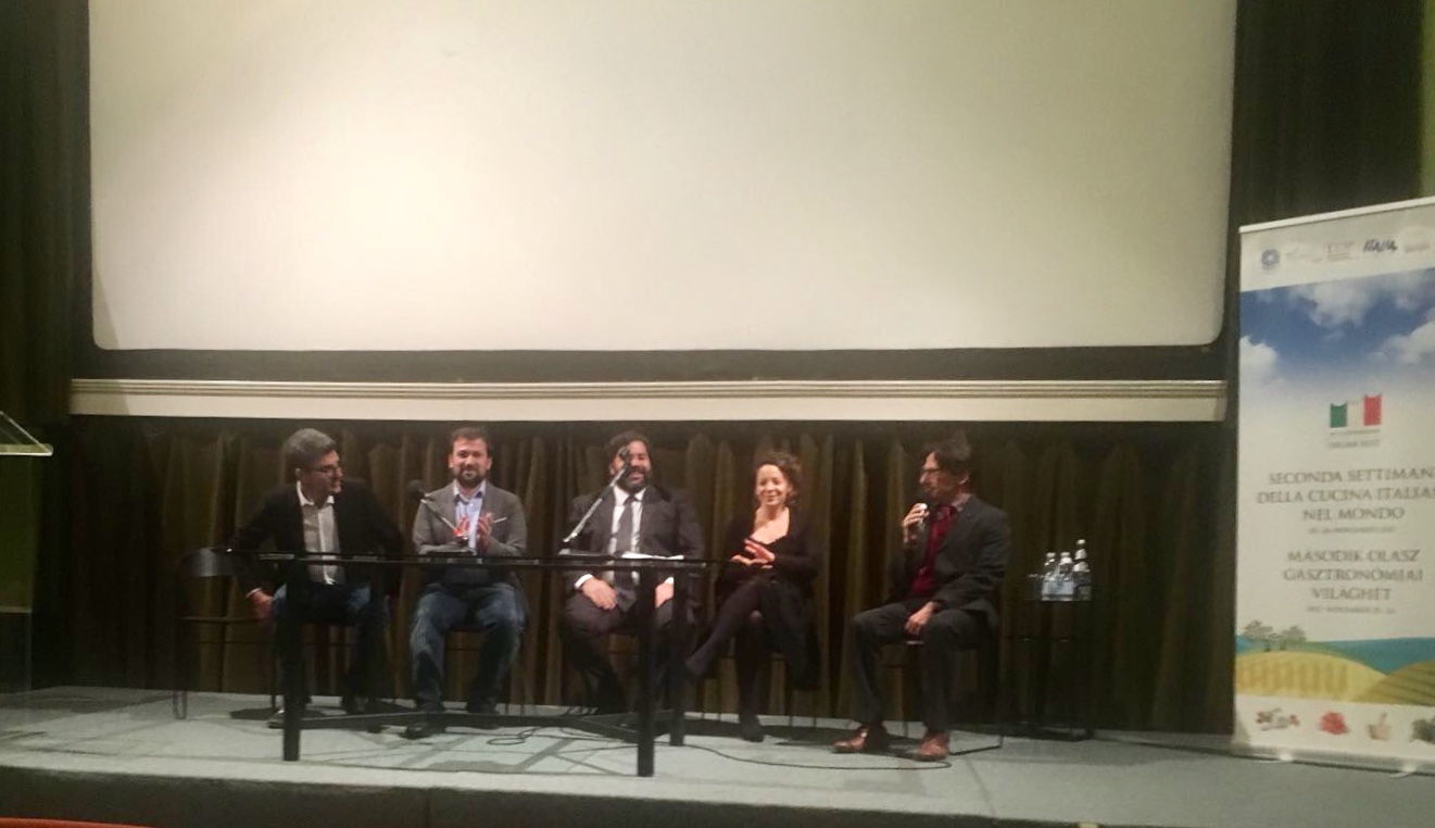 Anche per la Delegazione di Budapest la II Settimana della Cucina Italiana nel Mondo è stata ricca di eventi. Foto 1: Premiazione chef Mario Palermo Premio 2017 " Gustando il cinema". Da sinistra verso destra: Gian Luca Borghese Direttore IIC Budapest, Michele Fasciano Vice Delegato di Budapest, Alberto Tibaldi Delegato di Budapest, Mario Palermo chef mondiali di nuoto a Budapest, Sarah Maestri attrice. Foto 2: locandina dell'evento.Premiazione chef Mario Palermo Premio 2017 " Gustando il cinema". Da sinistra verso destra: Gian Luca Borghese Direttore IIC Budapest, Michele Fasciano Vice Delegato di Budapest, Alberto Tibaldi Delegato di Budapest, Mario Palermo chef mondiali di nuoto a Budapest, Sarah Maestri attrice. Foto 3: presentazione " Finchè c'è prosecco c'è speranza": da sinistra Gabor Agoston (produttore esecutivo), Antonio Padovan (regista), Nicola Fedrigoni (produttore), Gian Luca Borghese (Direttore IIC di Budapest). Foto 4: produttore esecutivo, anteprima film. Foto 5: Tavola rotonda "Cibarsi all'italiana" , da sinistra: Carlo Volpe (Direttore OvariTej lavorazione e produzione latticini), Andrea Bettini (ItaliaMilk produzione mozzarelle di bufala), Pia Bosca (Amm. Delegato Bosca Vini spa), Massimo Rustico (Ambasciatore d'Italia), Alberto Tibaldi (Delegato di Budapest), Gian Luca Borghese (Direttore IIC), Szabo Gyozo (università Pazmany), Giacomo Pedranzini (Amm. Delegato Kometa spa Lavorazioni e carni suine).