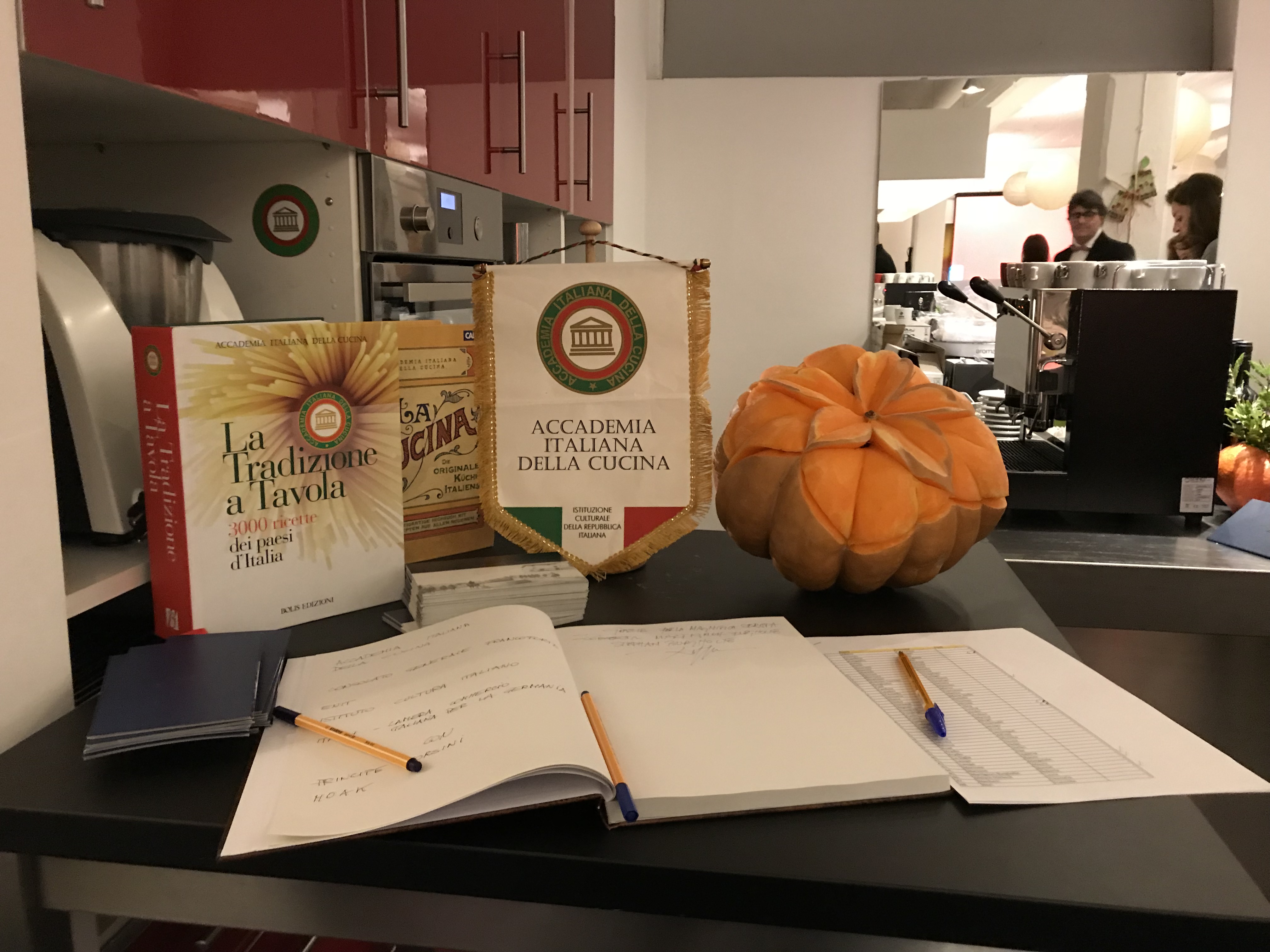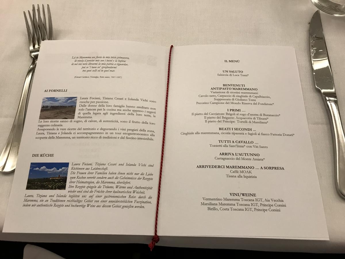 “Un territorio da scoprire: saperi e sapori di Maremma” è il titolo della cena che ha chiuso gli eventi culturali ed enogastronomici tenutisi a Francoforte (Germania) in occasione della II Settimana della Cucina Italiana nel Mondo. Foto 1:la Principessa Corsini, seconda a destra, con le tre cuoche maremmane Laura Fociani (in ordine da destra) Tiziana Cesari e Iolanda Vichi. Foto 2: menu della serata. Foto 3: La principessa Giorgiana Corsini presenta i vini della Tenuta Marsiliana. Foto 4: Emanuele Gatti, Pesidente Camera Commercio Italiana per la Germania, Laura Melara-Dürbeck, Delegata di Francoforte. Foto 5: presentazione con stemma e volume dell'Accademia Italiana della Cucina.