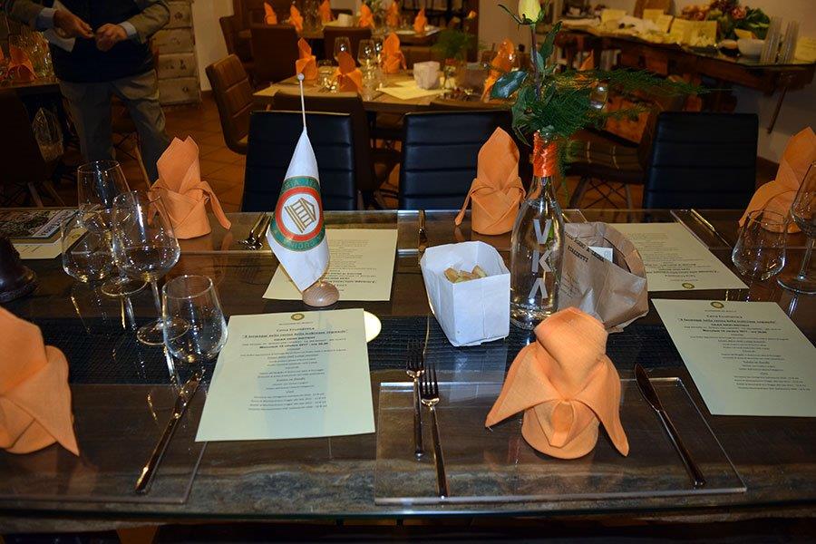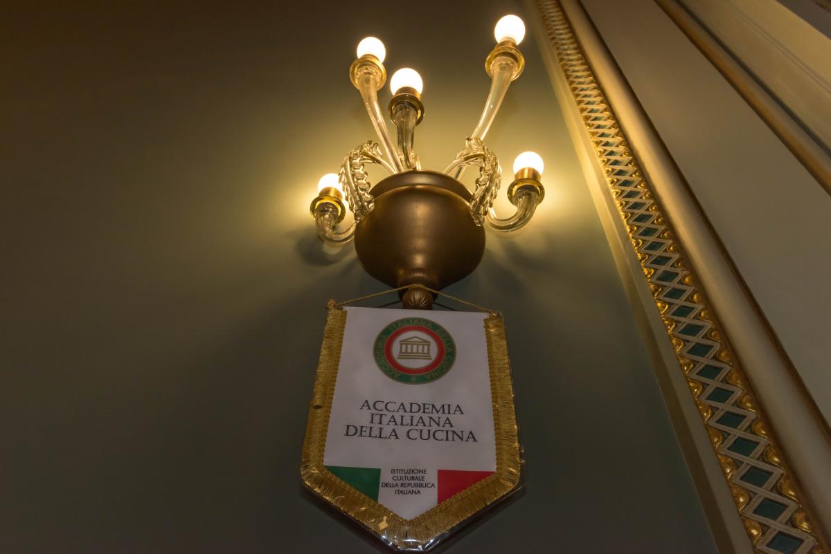 In occasione della II Settimana della Cucina Italiana nel Mondo, la Delegazione di Bucarest, in collaborazione con l’Ambasciata Italiana di Bucarest e il Teatro dell’Opera, ha organizzato un evento dal titolo “Cucina all’Opera” che si è espresso con la presentazione dell’opera “Madama Butterfly” di Giacomo Puccini e a seguire un ricco buffet presso un salone del teatro dell’opera. Foto 1: foto di gruppo con gli ospiti della serata. Foto 2 e 3: da sinistra: Marcello Mottadelli, Direttore dell'Opera; Marco Giungi, Ambasciatore d'Italia in Romania; Luigi Zaccagnini, Delegato di Bucarest. Foto 4 e 5: momenti della serata durante la cena. Foto 6: logo dell'Accademia.
