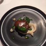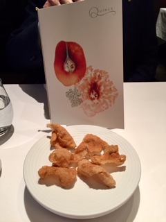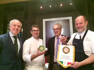Cena conclusiva della II Settimana della Cucina Italiana nel mondo presso il ristorante "Quince" uno dei più prestigiosi ristoranti della città. Foto 1: capocollo di maiale con fichi d’india, Marsala, senape selvatica e cavolfiori. Foto 2: Il Delegato Claudio Tarchi consegna il fermacarte dell’Accademia al cuoco Accursio Craparo (dell'omonimo ristorante a Modica, Sicilia), il Console Generale Lorenzo Ortona e lo chef-proprietario di “Quince”, Michael Tusk, con il guidoncino accademico. Foto 3: pranzo al Ristorante “Quince” con chef ospite Accursio Craparo, copertina del menu con il “pane d’aria”.