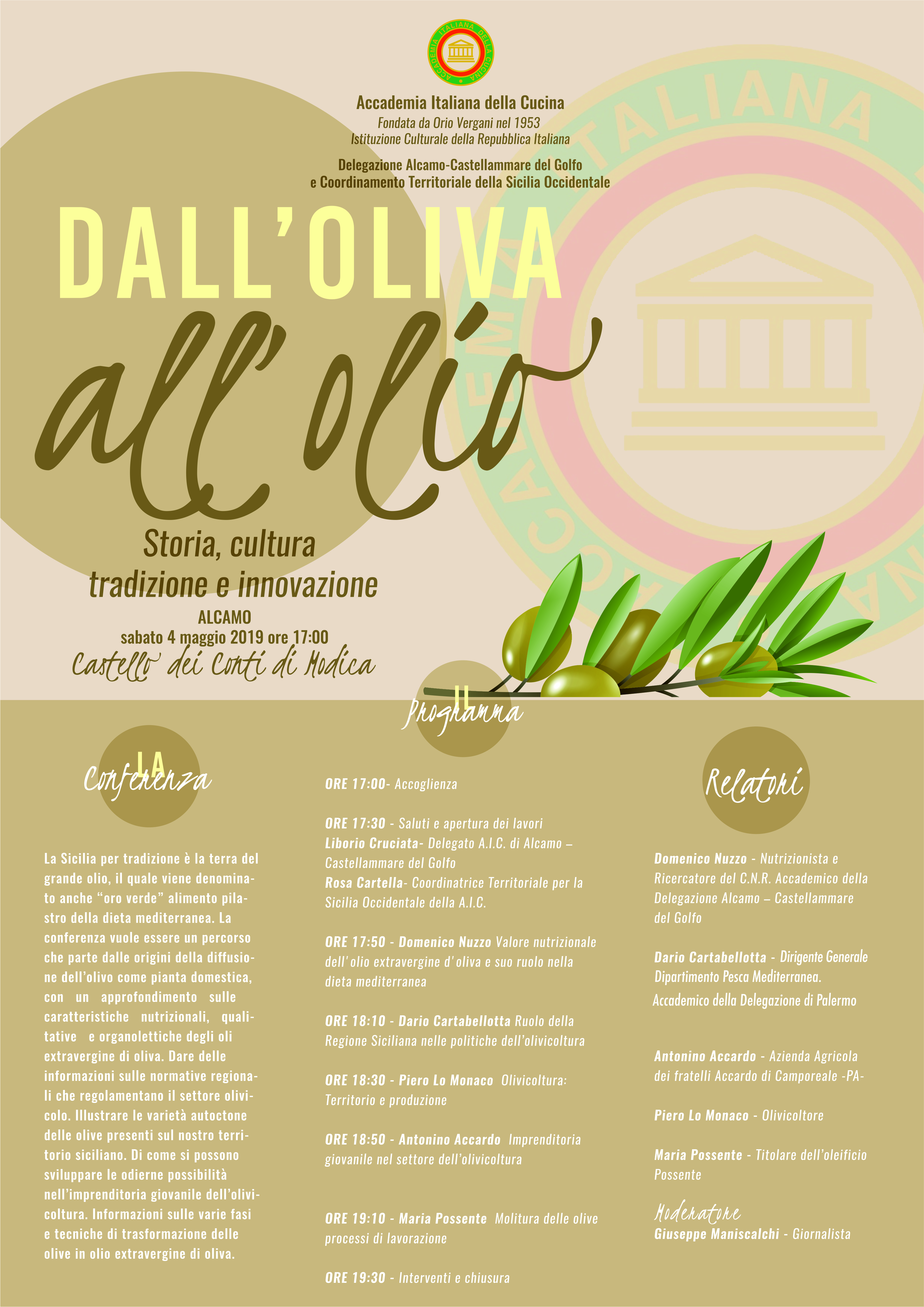 La Delegazione di Alcamo-Castellammare del Golfo organizza un convegno dal titolo "Dall'olivo all'olio" che si terrà il giorno sabato 4 maggio.