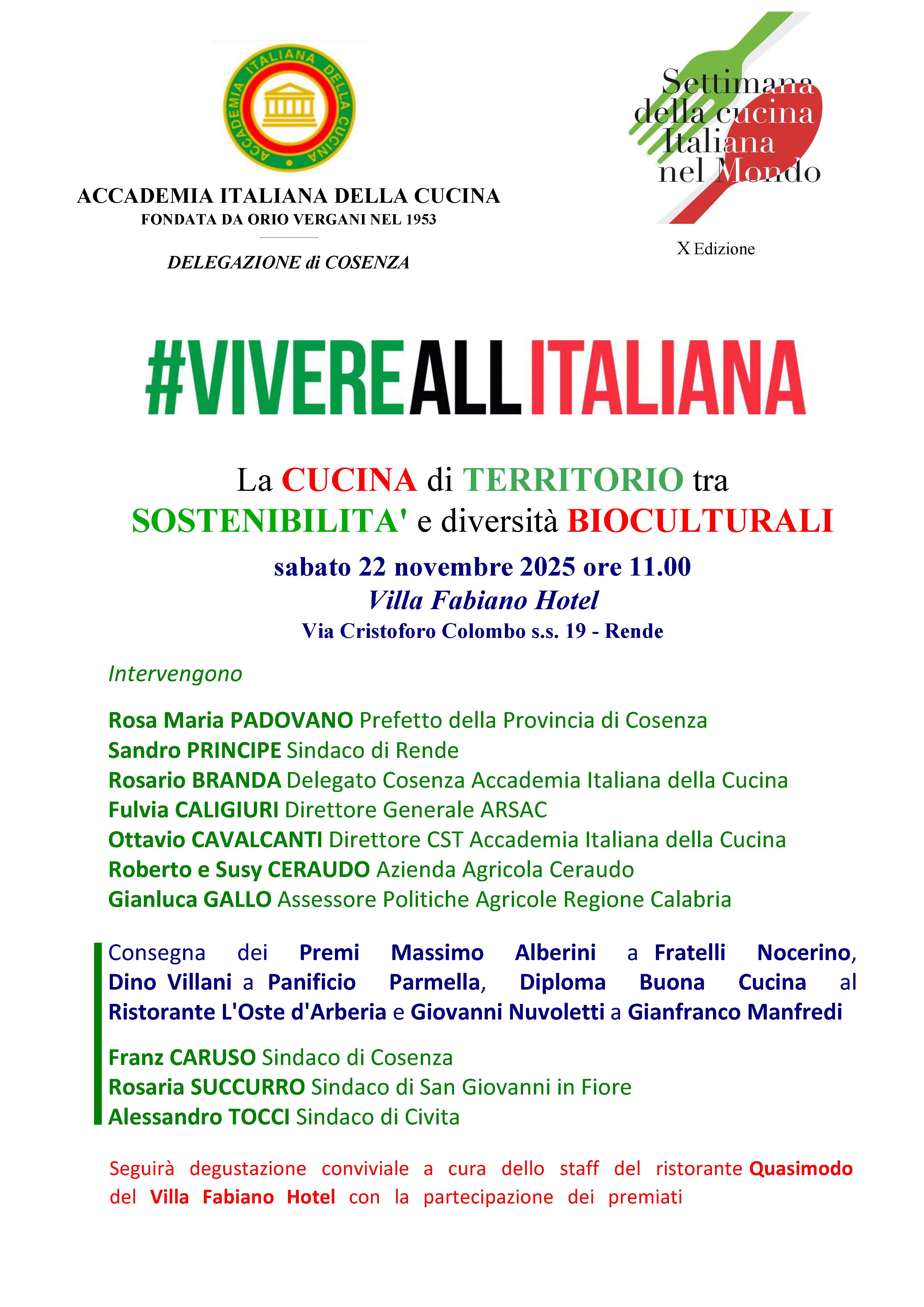 Anche la Delegazione di Cosenza rende omaggio alla manifestazione mondiale "Settimana della Cucina Italiana nel mondo", giunta alla X edizione, con lo svolgimento di un convegno sul tema "La Cucina di Territorio tra sostenibilità e diversità bioculturale".
