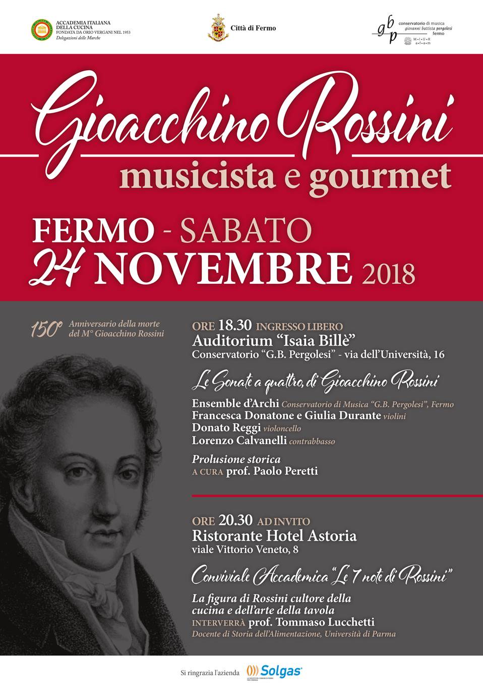 La Delegazione di Fermo ha organizzato per sabato 24 novembre un evento su Gioacchino Rossini musicista e gourmet, con il patrocinio del Comune di Fermo e del Conservatorio G.B. Pergolesi.