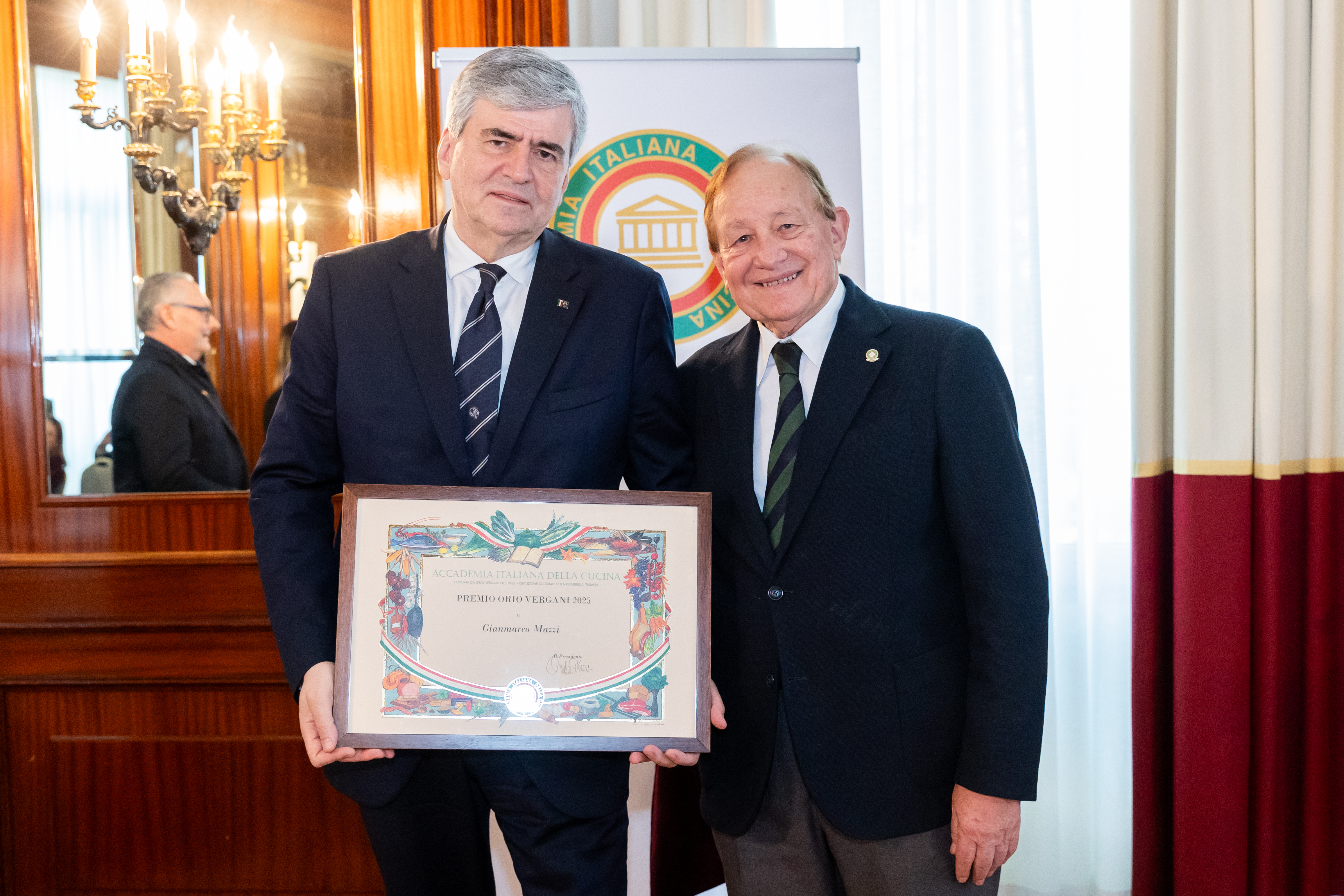 Il prestigioso premio “Orio Vergani” è stato consegnato dal Presidente Paolo Petroni all’Onorevole Gianmarco Mazzi, colonna portante e firmatario, nella qualità di Sottosegretario di Stato alla cultura con delega UNESCO, della candidatura della Cucina Italiana a Patrimonio Immateriale dell’umanità, per il contributo profuso nella diffusione internazionale della cultura gastronomica italiana e nella promozione delle eccellenze del nostro Paese nel mondo.