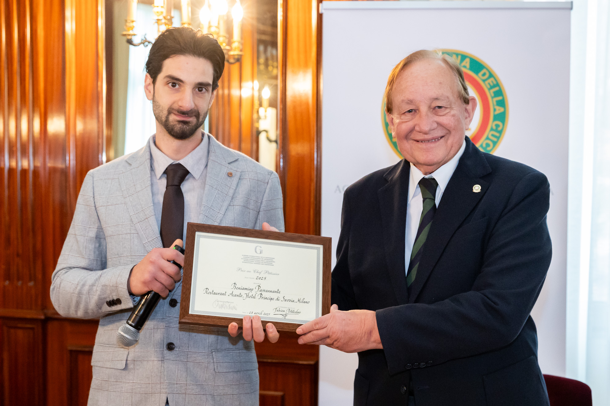 È seguita la consegna dei Prix Nationaux 2025 dell’Académie Internationale de la Gastronomie. I premi sono stati assegnati a: Fabrizio Mellino (Prix au Chef de l’Avenir), Beniamino Passannante (Prix au Chef Pâtissier), Lukas Gerges (Prix au Sommelier) e Mauro Bassini (Prix de la Littérature Gastronomique).