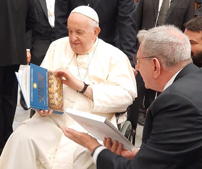 Lo scorso mercoledì 21 dicembre, al termine dell’Udienza Papale che si è tenuta nella Sala Paolo VI, il nostro Vice Presidente Vicario Mimmo D’Alessio ha illustrato al Santo Padre le finalità dell’Accademia soffermandosi in particolare sulla sostenibilità e sullo spreco del cibo. Ha poi fatto dono al Pontefice del nostro volume La Cucina delle Festività religiose che ha trovato molto interessante.