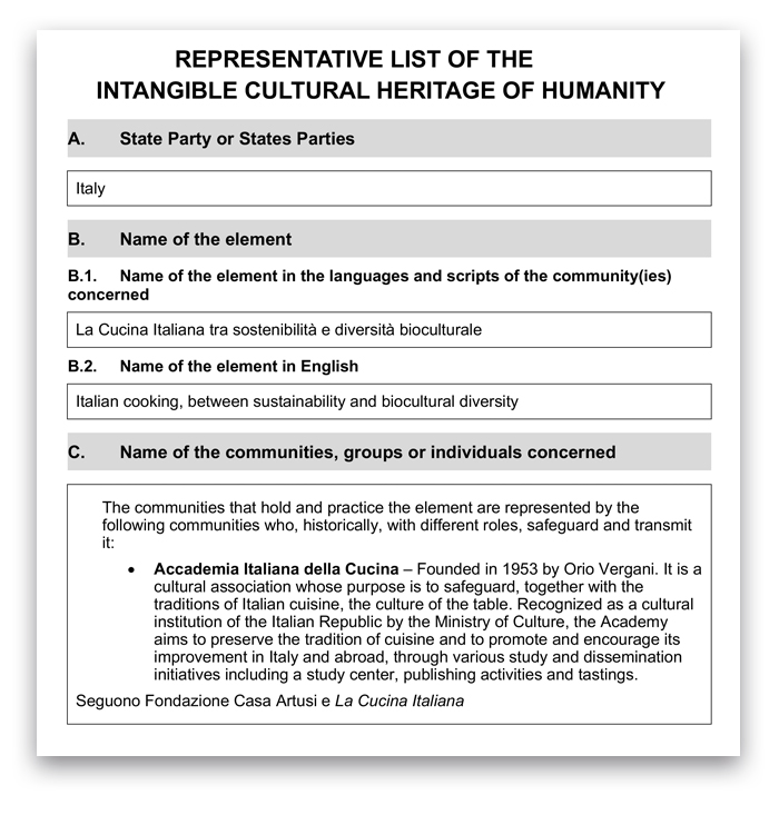 Il dossier italiano è stato elaborato dall’Accademia Italiana della Cucina, dalla Fondazione Casa Artusi e dalla rivista La Cucina Italiana, quindi presentato ufficialmente dal Governo attraverso i Ministeri della Cultura, dell’Agricoltura e degli Esteri. Al sostegno scientifico hanno contribuito esperti come l'Accademico onorario Massimo Montanari e il professor Pierluigi Petrillo.